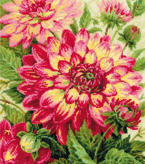 Express your love for arts and crafts with these beautiful cross stitch kits! Find a themed kit for any taste! This package contains 10 count white Aida Zweigart fabric, woolen/acrylic threads in eighteen colors, a needle, instructions and color chart. Design: Dahlias. Finished Size: 15.75x19.75 inches. Imported.
