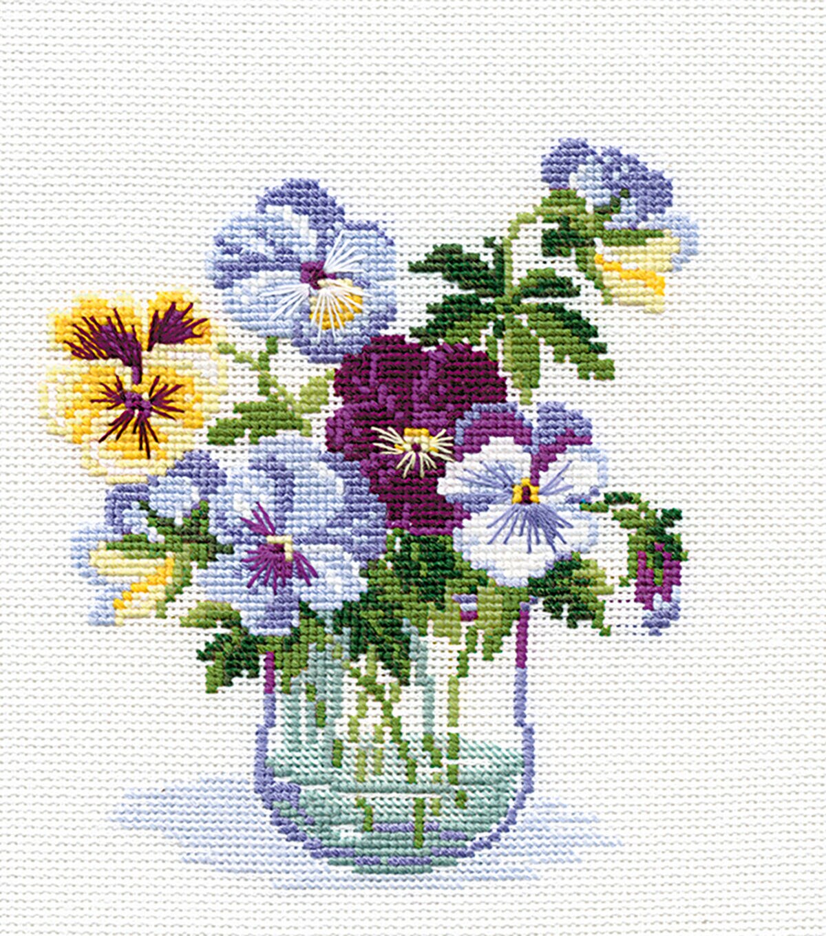 Express your love for arts and crafts with this beautiful RIOLIS Combopu Cama Counted Cross Stitch Kit-Pansies. Find a themed kit for any taste. This package contains 15-count flaxen Zweigart Aida fabric, Safil wool/acrylic yarn in 11 colors, one needle, instructions and color chart.