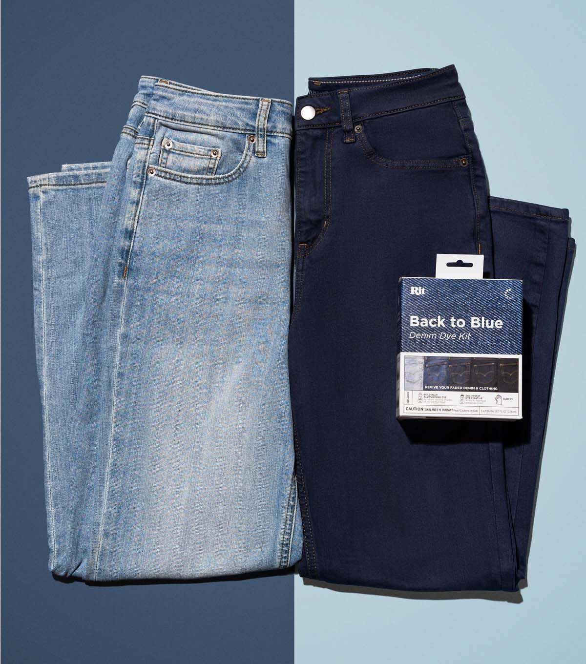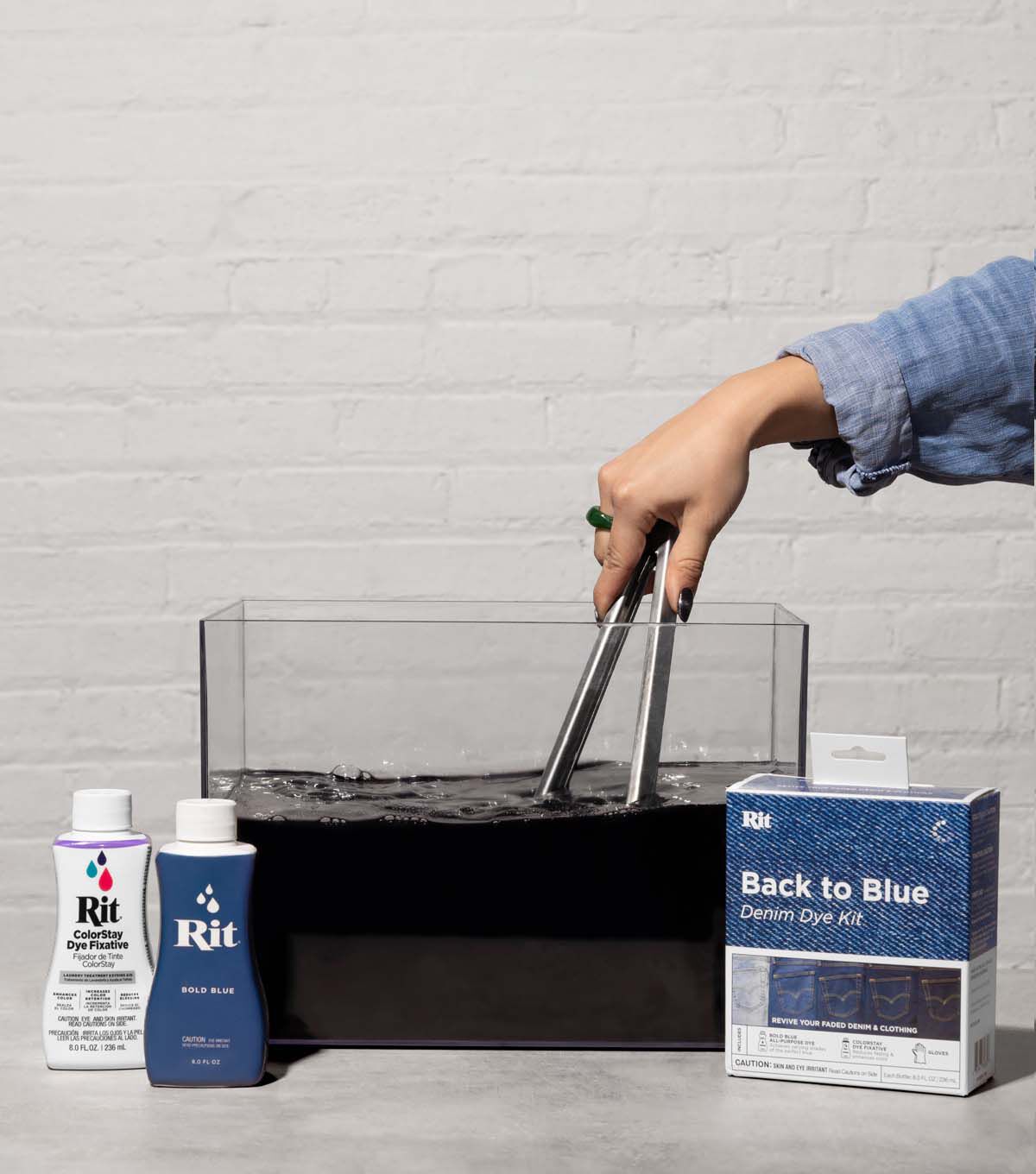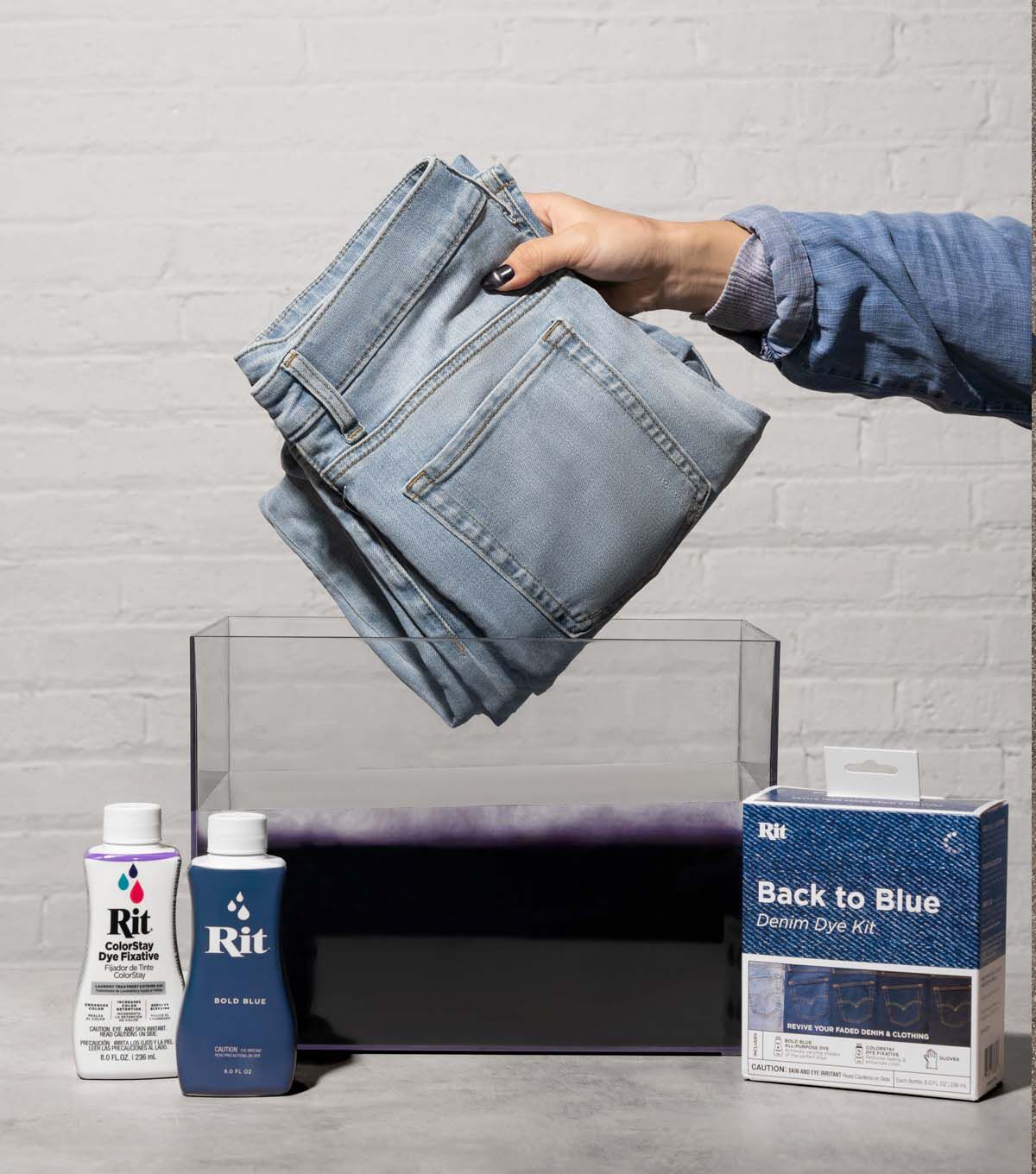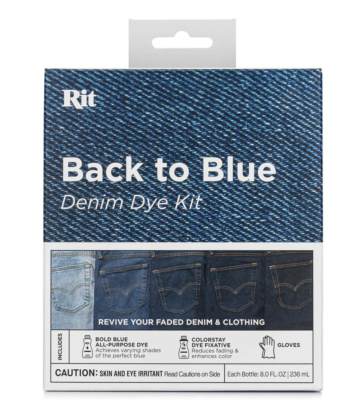 Are your favorite jeans faded? Now with Rit’s Back to Blue Denim Dye Kit, you can restore faded denim back to a rich blue in just a few easy steps. Included in the kit is Bold Blue All-Purpose Dye, a versatile blue that can achieve varying shades of the perfect blue. Proudly non-toxic and safe for sewer and septic systems. The kit also includes ColorStay Dye Fixative, our secret weapon to reduce bleeding and fading. Plus, a pair of gloves to protect your hands. Looking to dye something besides denim? This kit can also be used to revive faded blue clothing and even overdye clothing of any color to a darker shade. Do your part to reduce your carbon footprint by dyeing clothing instead of buying new, which reduces CO2 emissions by 80%. All you need is a washing machine, plastic container or stainless steel sink to get started.