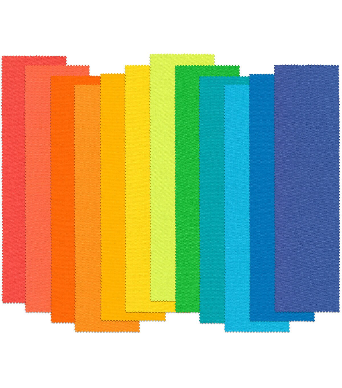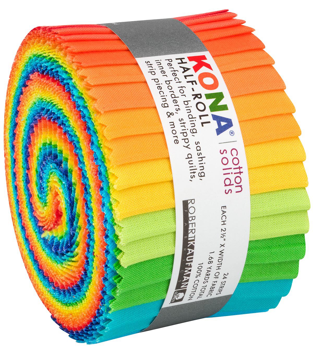 Half Roll bundle includes 24 Strips measuring 2.5"x Width of Fabric each in 12 colors of solid Kona Cotton. Perfect for binding, sashing, inner borders stip quilting and much more.