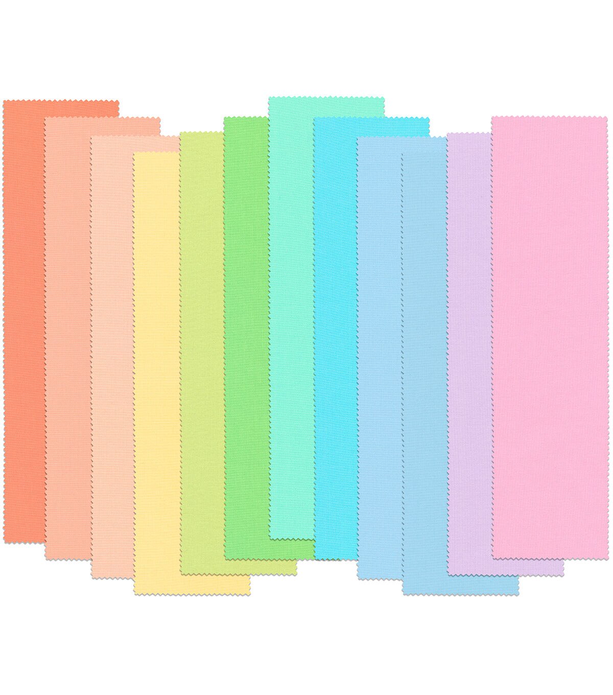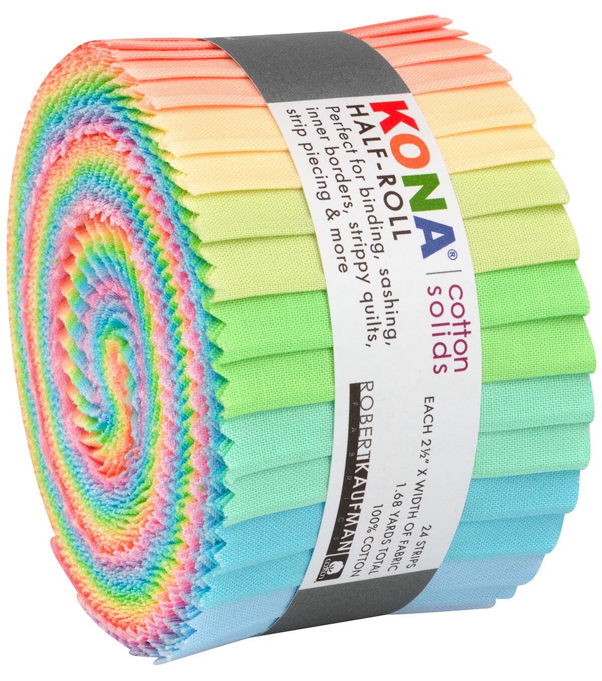 Half Roll bundle includes 24 Strips measuring 2.5"x Width of Fabric each in 12 colors of solid Kona Cotton. Perfect for binding, sashing, inner borders stip quilting and much more.