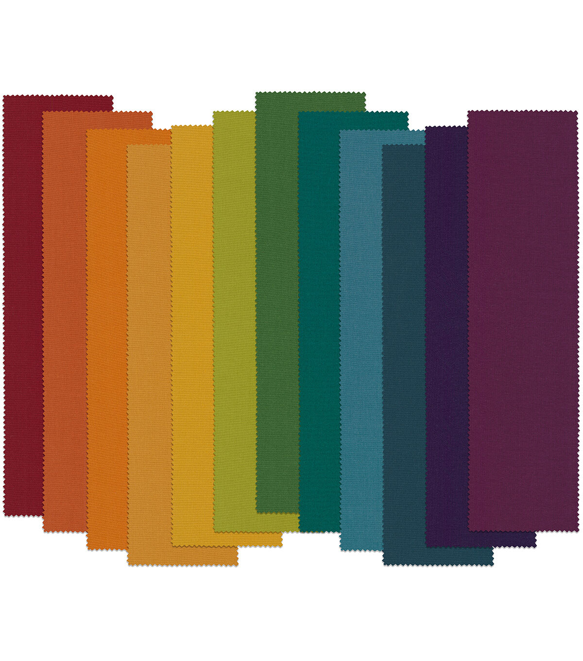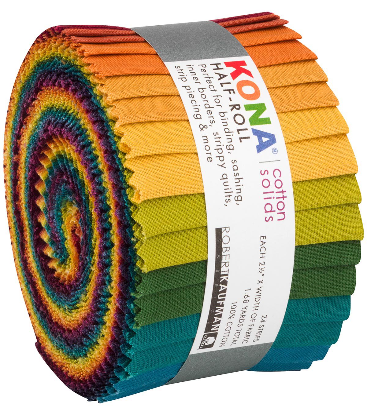 Half Roll bundle includes 24 Strips measuring 2.5"x Width of Fabric each in 12 colors of solid Kona Cotton. Perfect for binding, sashing, inner borders stip quilting and much more.