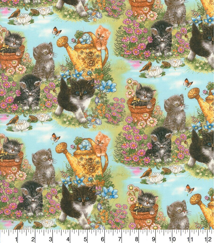 The naughty kittens on the Novelty Cotton Fabric-Kittens in Garden are having a ball of a time in a beautiful spring garden with pretty flowers, a flowing river, butterflies and frogs. Use it to stitch beautiful quilts, duvet covers, and you’ll love to wake up to this lovely and endearing sight every single day. Its delightfully soft hand and lightweight drape also make it perfect to stitch cute apparel, crib sheets, bibs and trendy accessories for your little one.