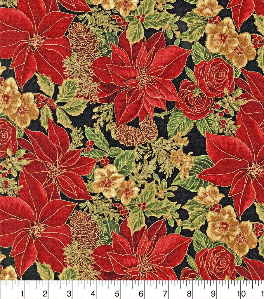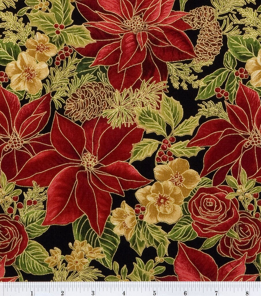 Get Festive with Robert Kaufman Poinsettias on Black Christmas Metallic Cotton Fabric