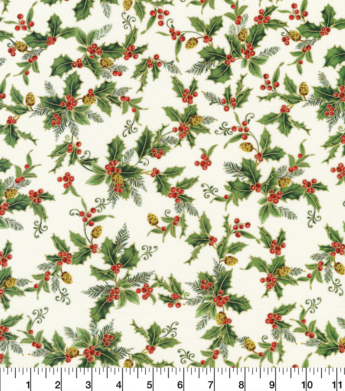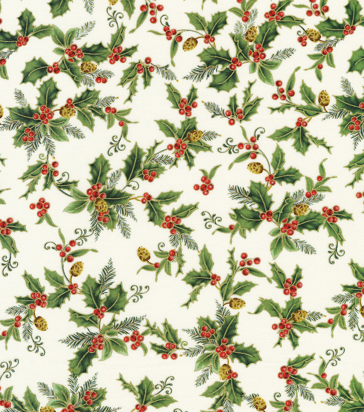 Get into the Holiday Spirit with Robert Kaufman Rich Berries on Cream Christmas Metallic Cotton Fabric