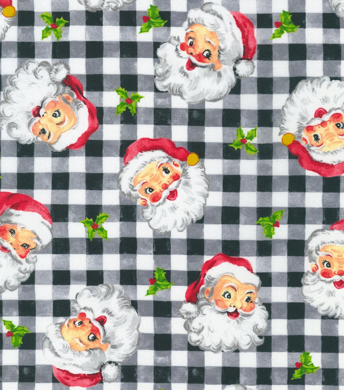 • Robert Kaufman Santa Heads on Black Plaid Christmas Cotton Fabric