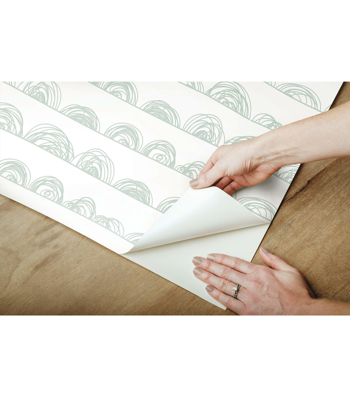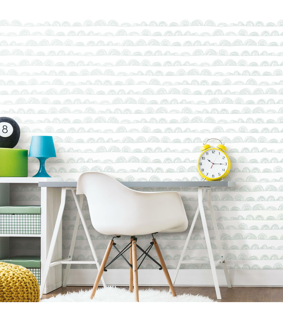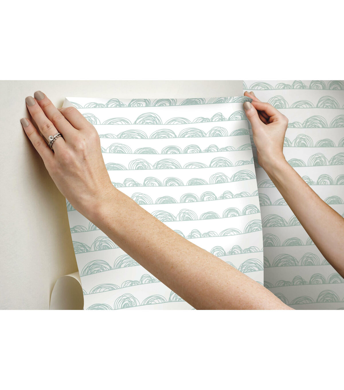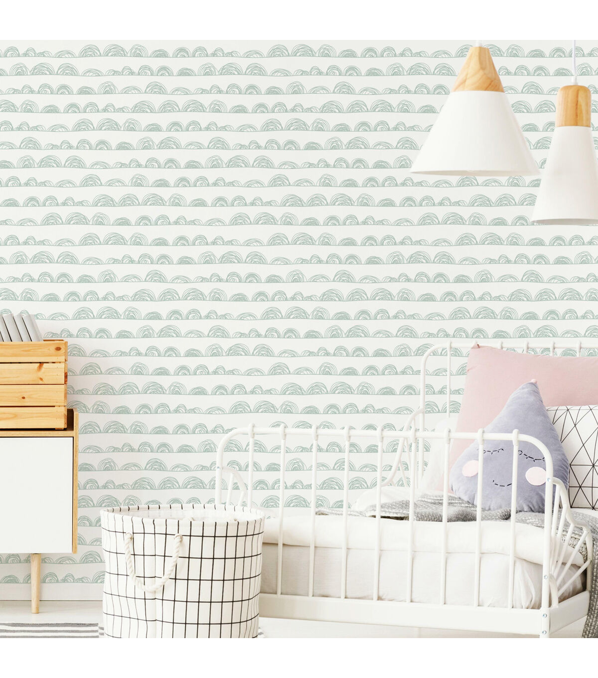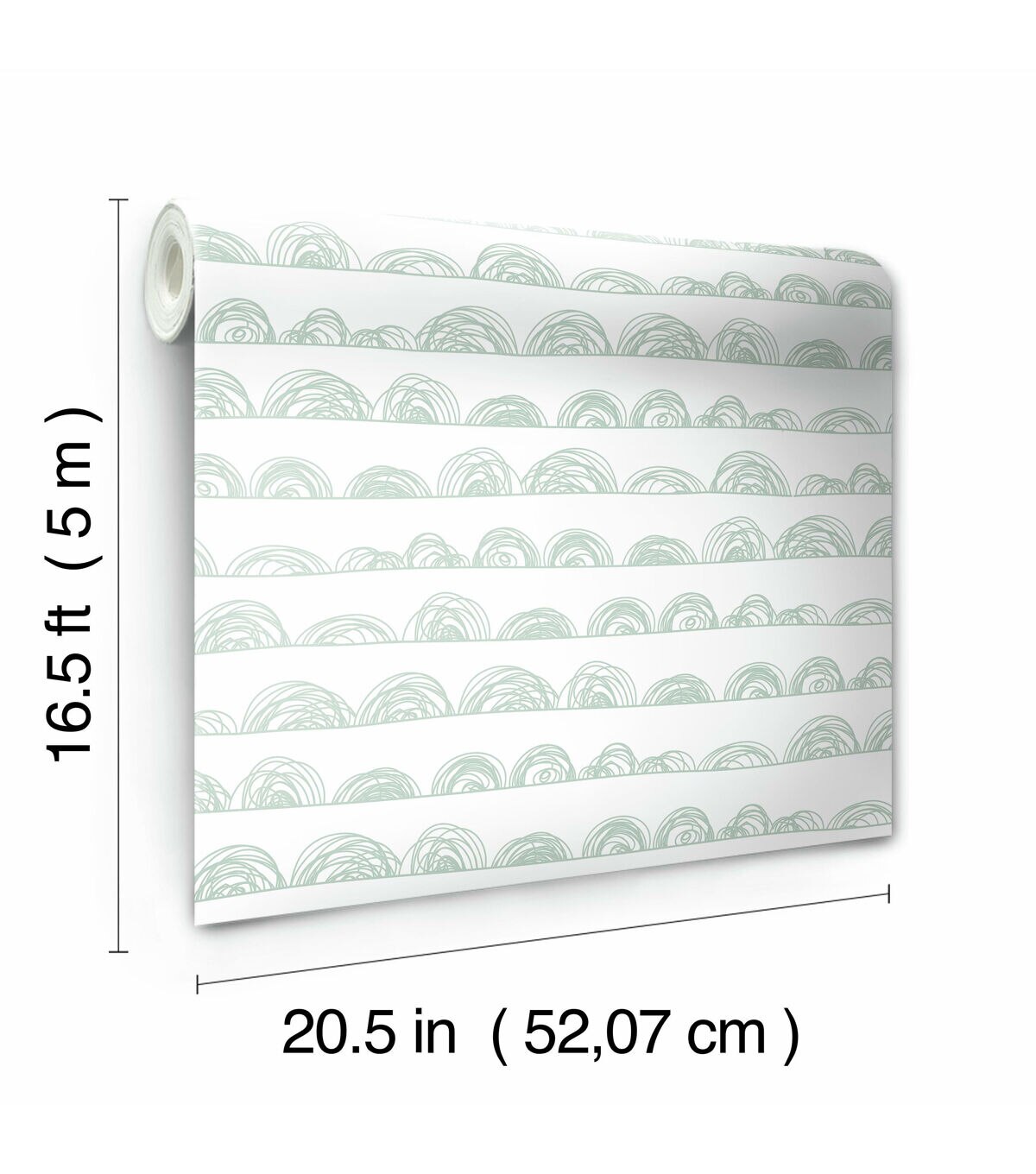 Playful line art creates visual impact in Doodle Scallop peel and stick wallpaper from RoomMates. Soft horizontal sketched lines anchor multiple doodle half circles that range in height and diameter for a touch of whimsey that is imaginatively simple. A clean white background is completed with mid-tone green pencil style loops making it the perfect wallpaper for children’s bedrooms, playrooms, or any room that desires a touch of youthful art. RoomMates peel and stick wallpapers are an easy and affordable way to decorate. Peel off the paper backing and smooth onto the wall, no additional adhesive required. When it’s time to redecorate, simply remove them effortlessly in full strips with no remaining sticky residue or damage to walls. 20.5 inches x 16.5 feet 18 Repeat. Straight Match. 28.18 square feet