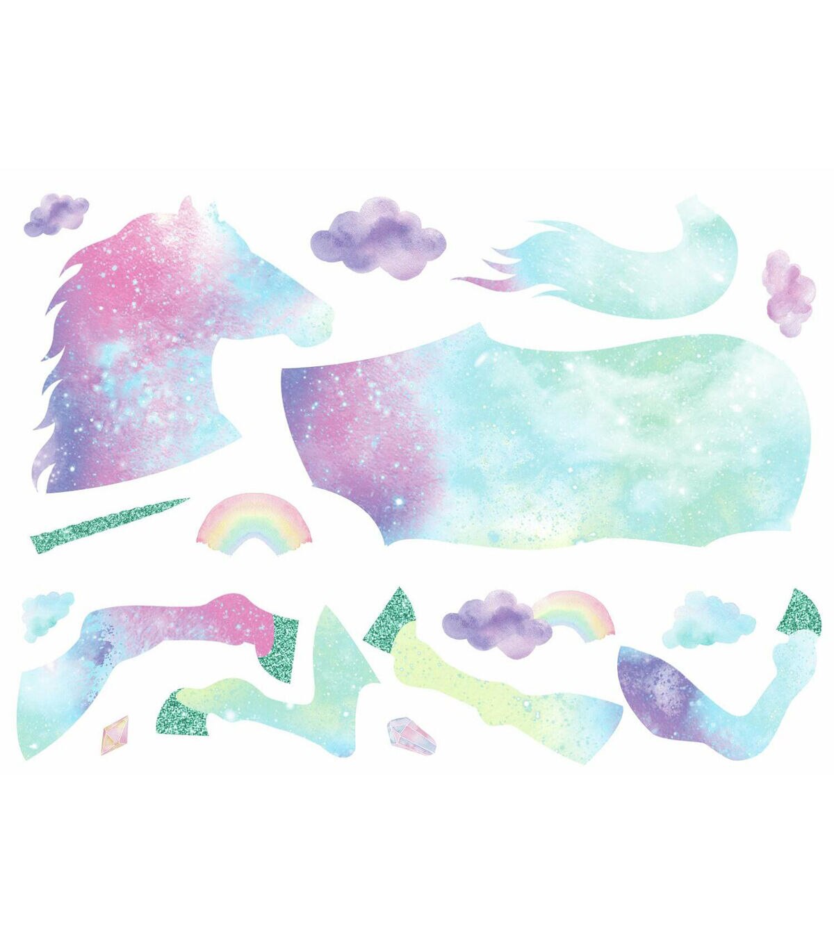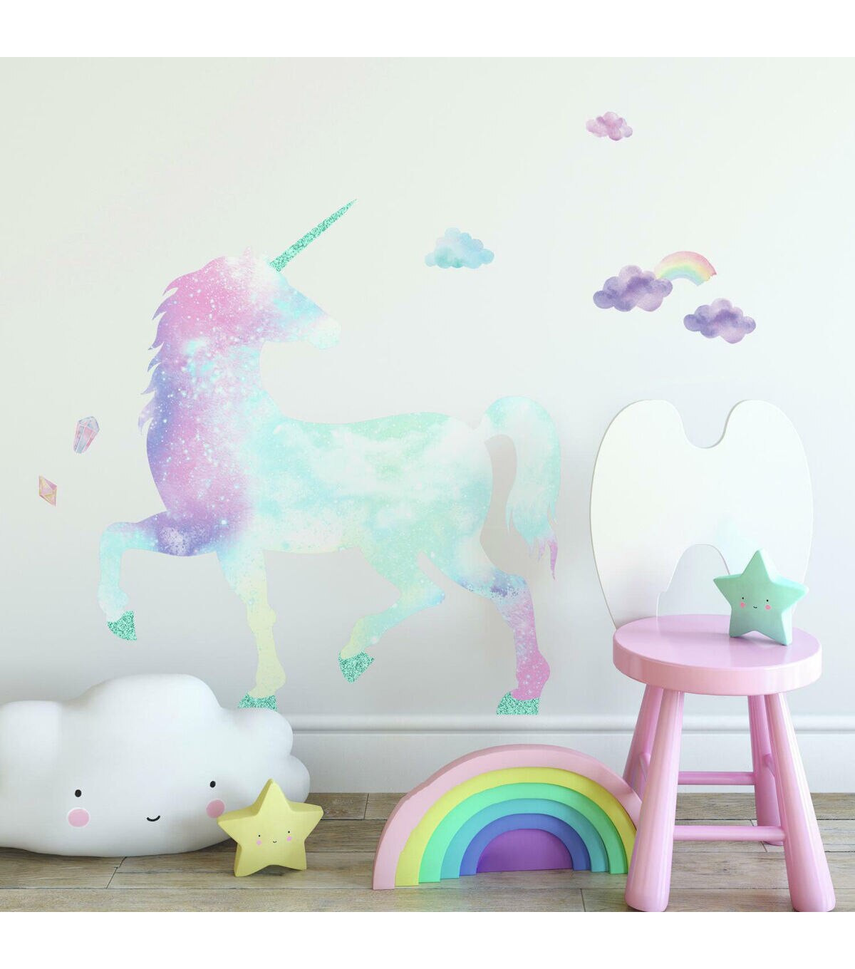 Perfect for the little lady with a sense of wonder, fill her space with sparkles and magic. This whimsical wall decal pack includes wall stickers that assemble in seconds to create a giant unicorn, plus peel and stick rainbows, clouds and gemstones. Guaranteed removable, reusable and repositionable, wall decals go up in minutes; just peel and stick! Best on smooth, clean surfaces, decals will not damage the wall or leave a tacky film behind when removed. Backed by our state-of-the-art peel and stick technology, our decals can be used again and again on multiple surfaces so you can change it up in an instant. Quick to install in seconds, turn walls magical with Galaxy Unicorn Peel and Stick Giant Wall Decals with Glitter from RoomMates.