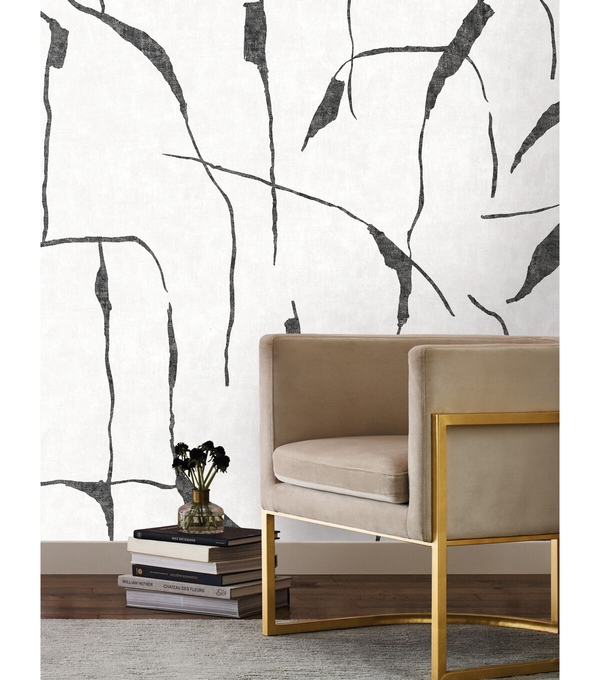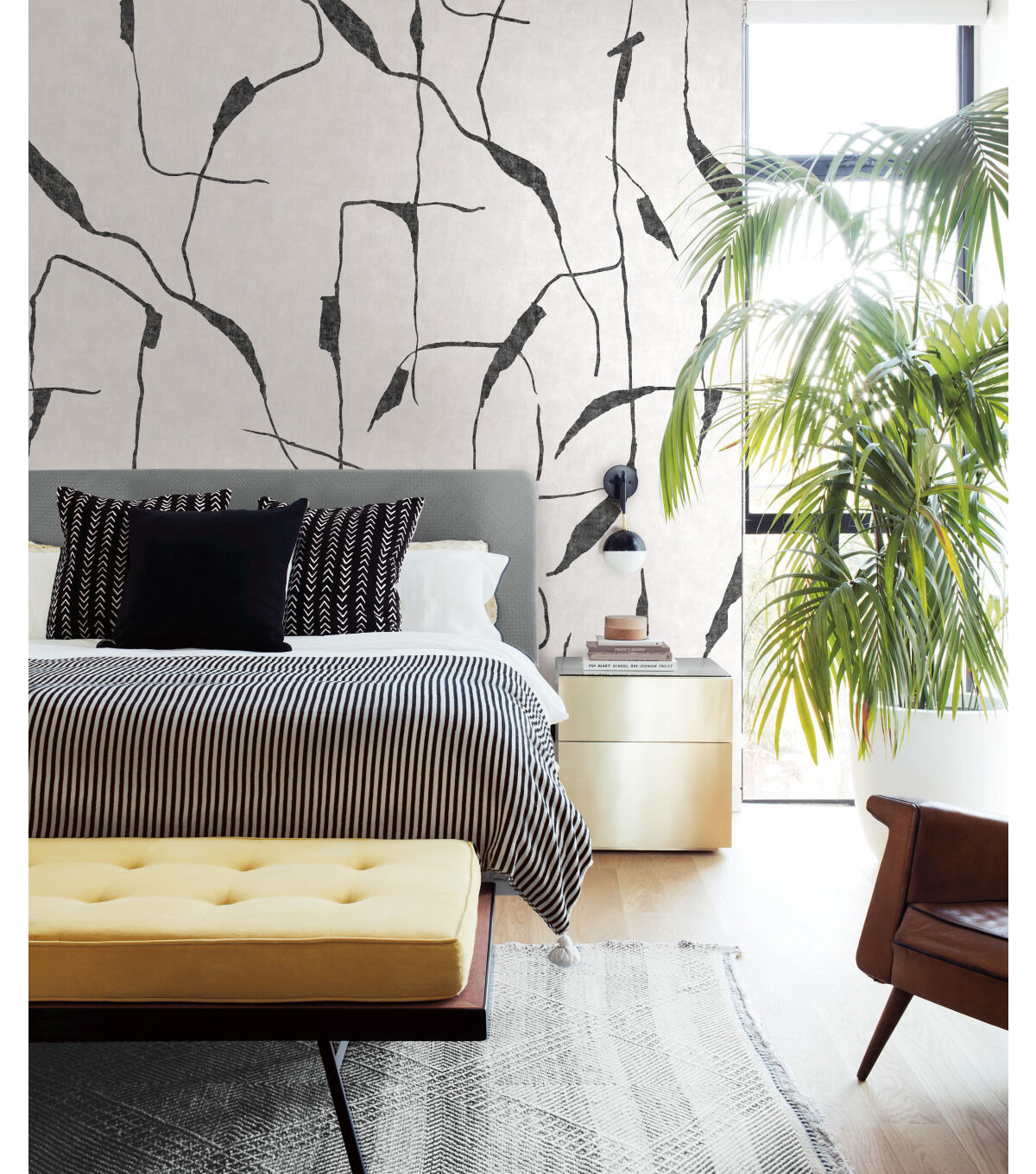 The Ivory Coast mural by Nikki Chu for RoomMates is the quintessential wall motif for simply stated sophistication with its softly textured light gray backdrop and artistic etching graphic overlay.