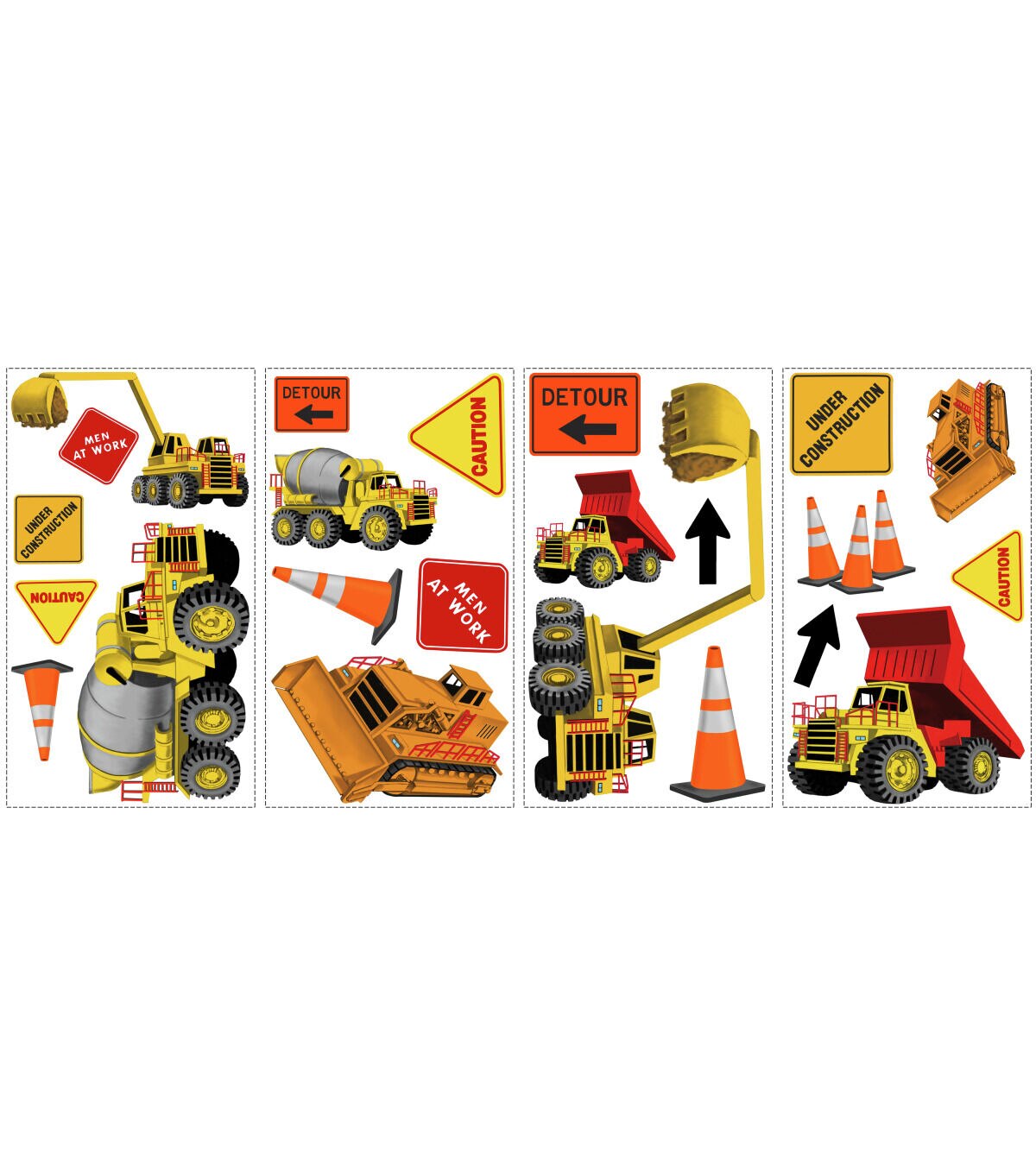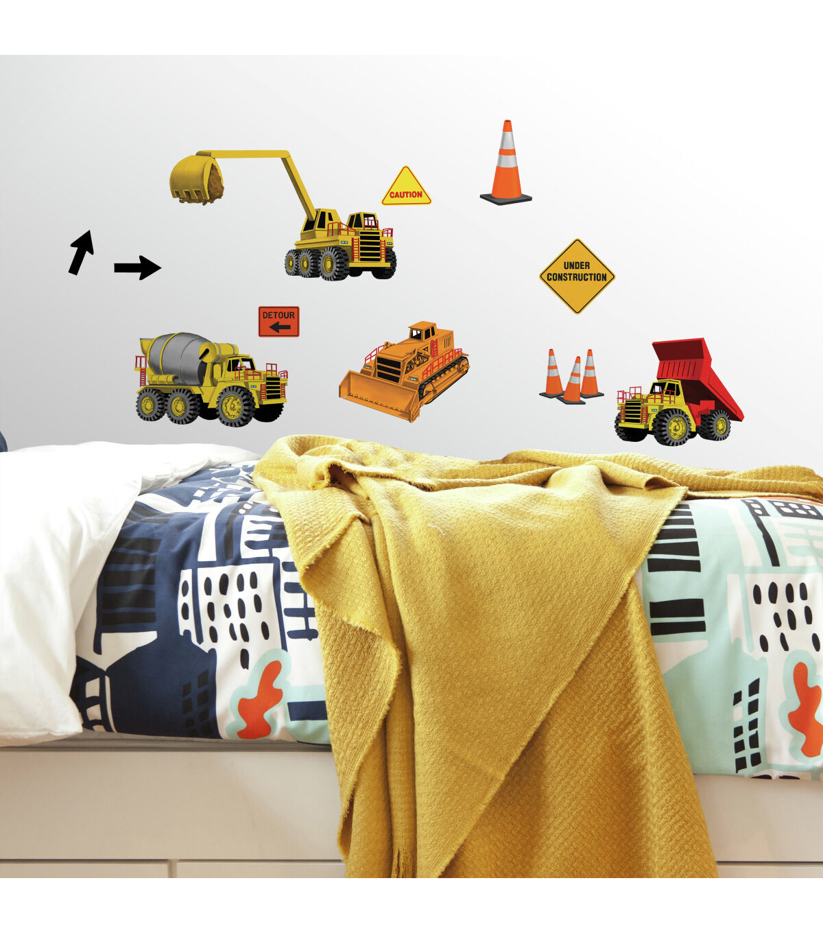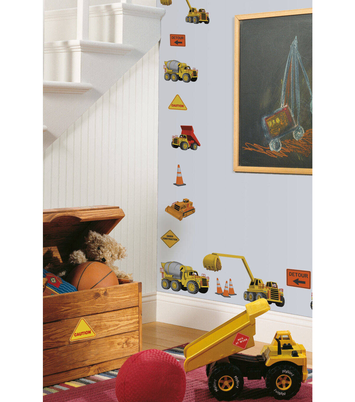 No need for a hard hat! Our Under Construction set of wall stickers comes complete with brightly colored dump and cement trucks, cranes, and construction signs. Because RoomMates can be moved around again and again, you can change the layout of your construction site as often as you please. Check out the coordinated self-adhesive border (sold separately) for the ultimate finishing touch.