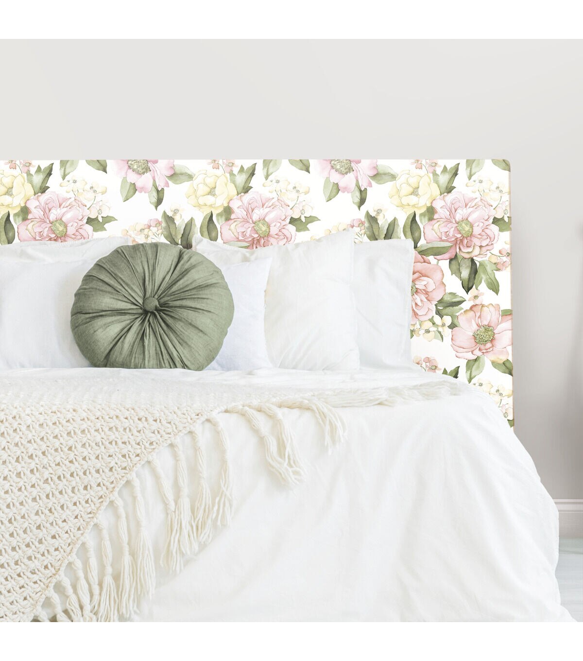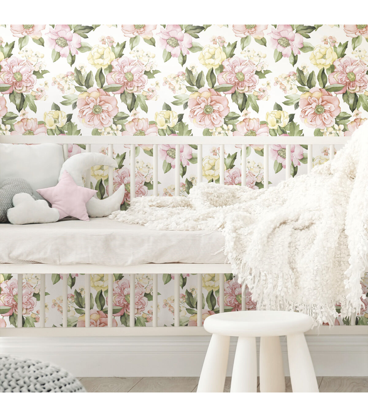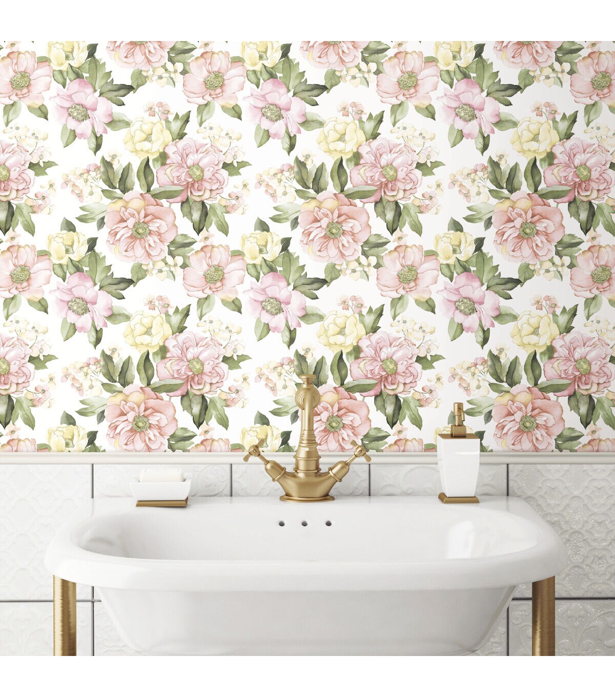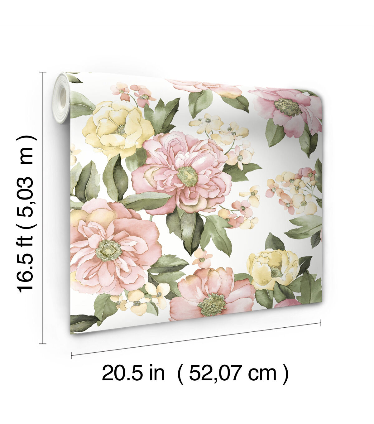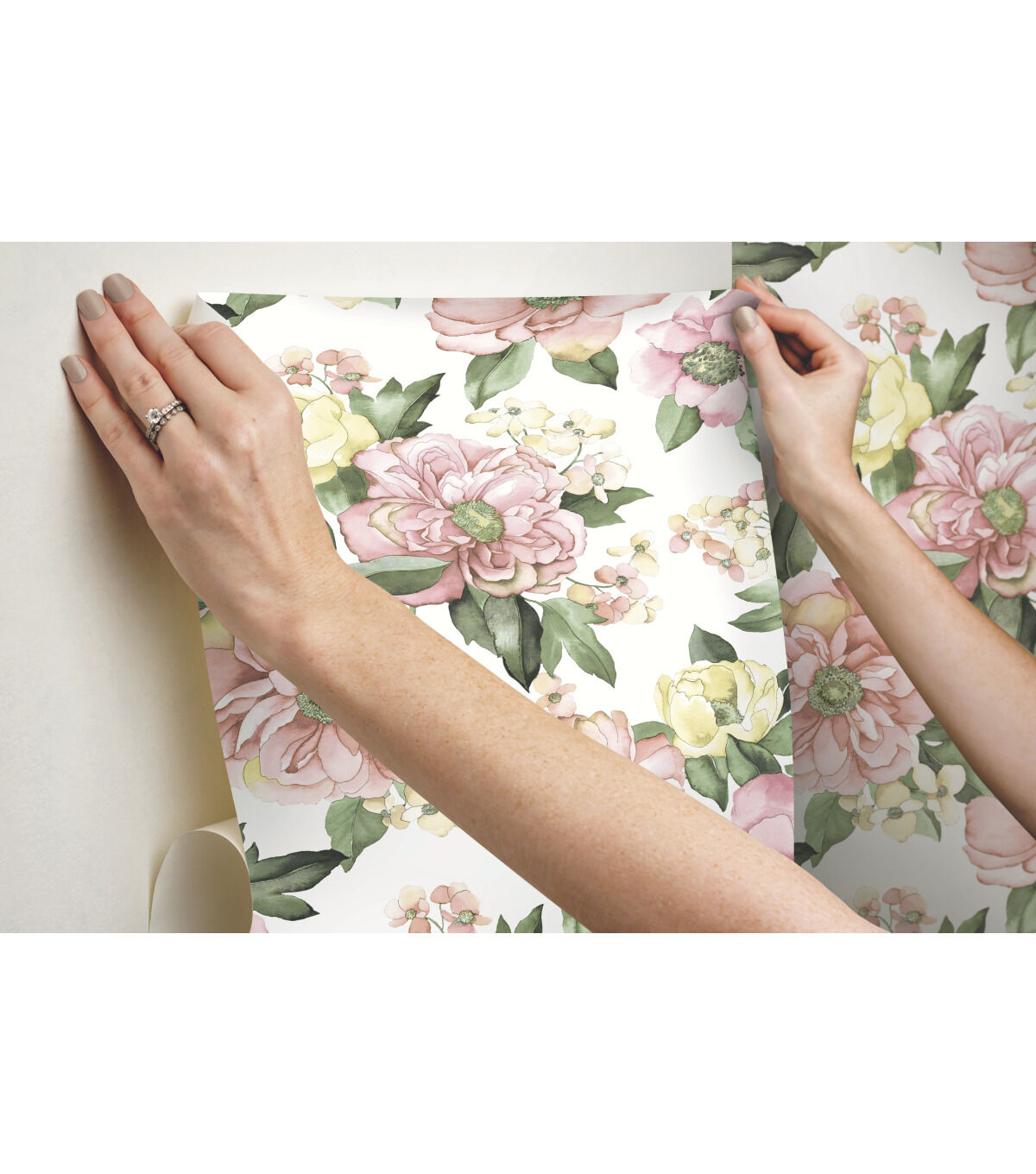 A pretty burst of blooms brings the beauty of the garden into your home with Watercolor Floral Bouquet peel and stick wallpaper from RoomMates. Peonies, roses and flowers that suggest extravagant bushes with a multitude of blossoms are rendered in watercolor effect with a lovely palette of soft pinks and yellows with mid tone green leaves. This romantic design is a compliment to white and natural furniture, rattan and wicker, or to mellow contemporary furniture lines in any room in the home. RoomMates peel and stick wallpapers are an easy and affordable way to decorate. Peel off the paper backing and smooth onto the wall, no additional adhesive required. When it’s time to redecorate, simply remove them effortlessly in full strips with no remaining sticky residue or damage to walls.