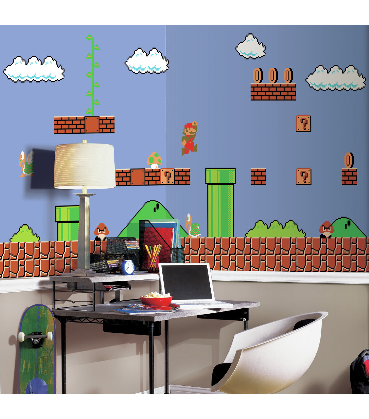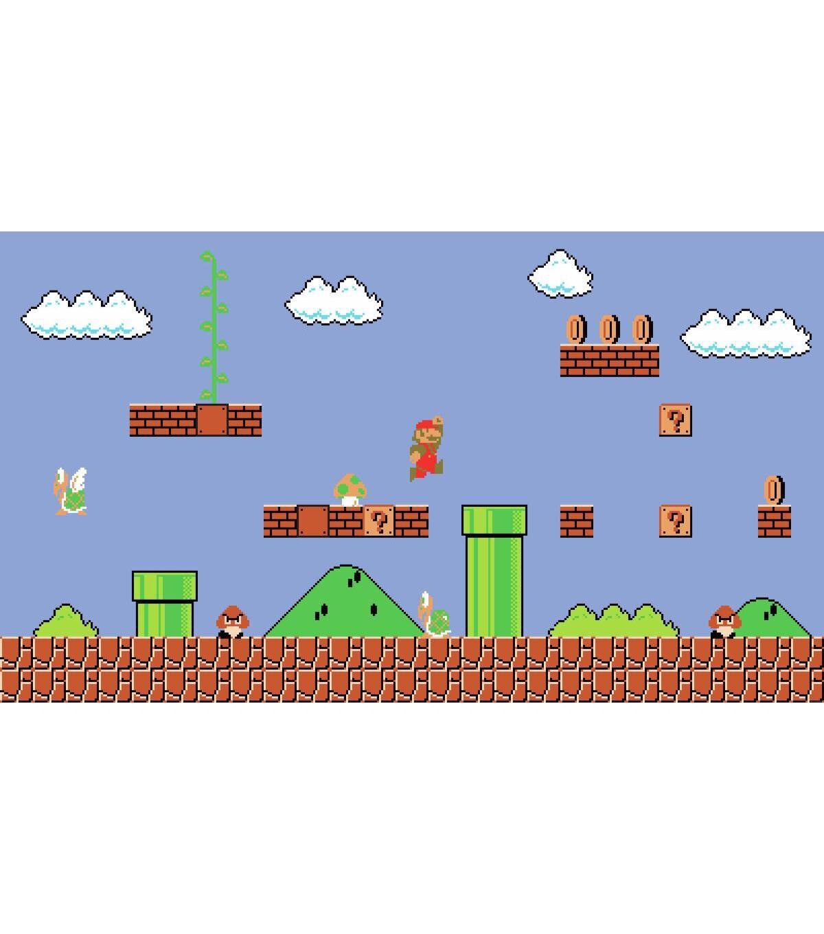 This Retro Super Mario XL Wallpaper Mural is a true blast from the past! Depicting a classic Mushroom Kingdom scene from the classic Super Mario video game, make any game room, playroom or other smooth flat surface pop with this Retro Super Mario XL wall mural. To add this life-sized wall mural to the surface, simply activate each panel with warm water and place directly onto the surface. You will be geared up to save Princess Toadstool in no time!