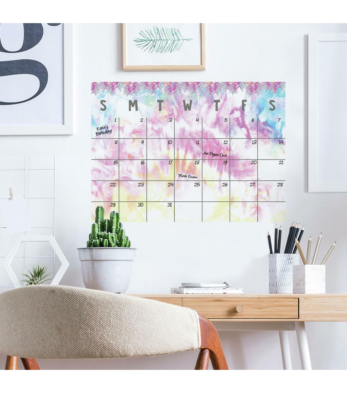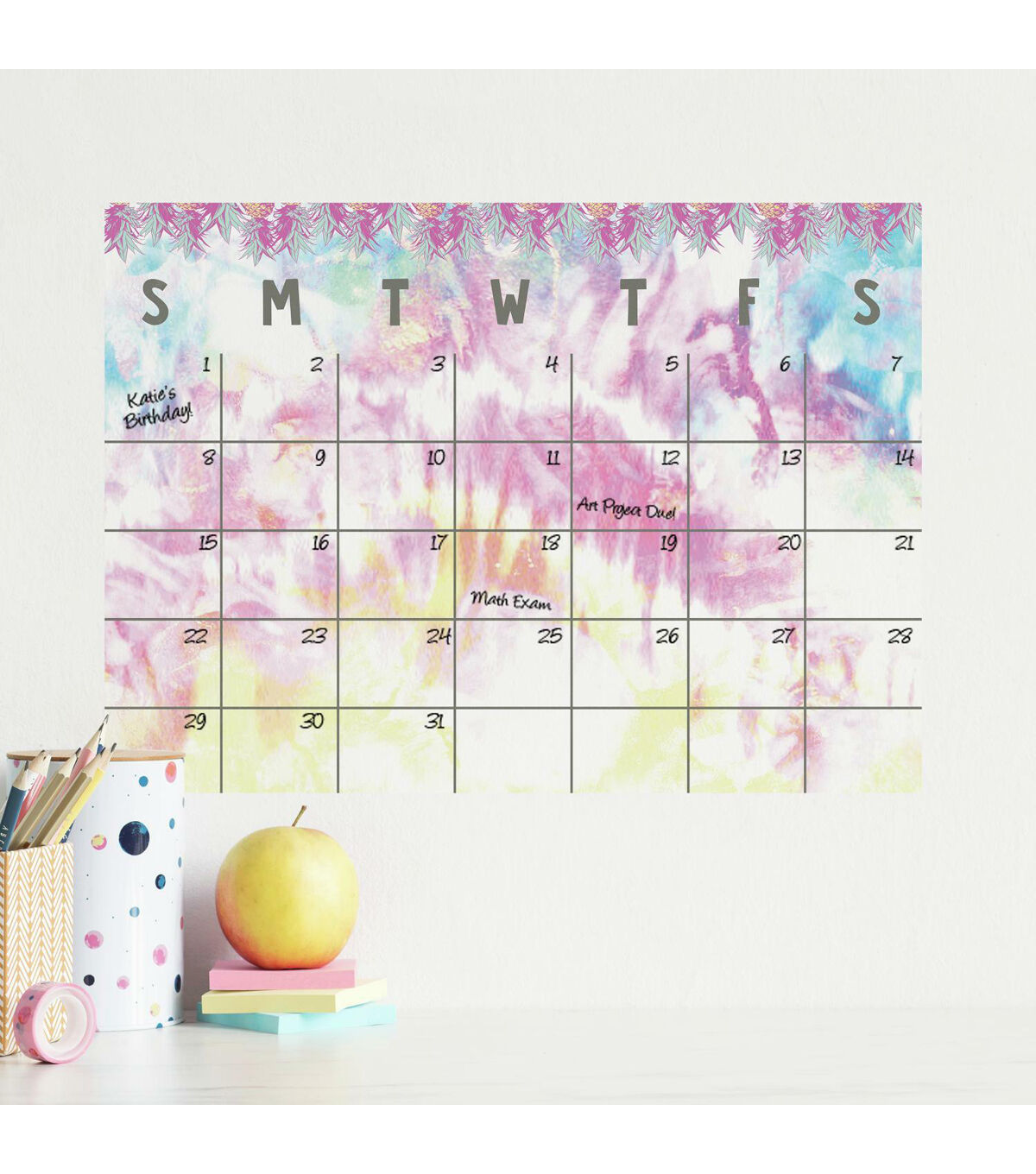 Add a groovy touch to your wall with this lovely dry erase calendar peel and stick decal. Designed to create a fun, playful feeling, decorate your bedroom, workspace, or family area with this wall calendar. Simply peel and stick to any smooth surface, and you're done!