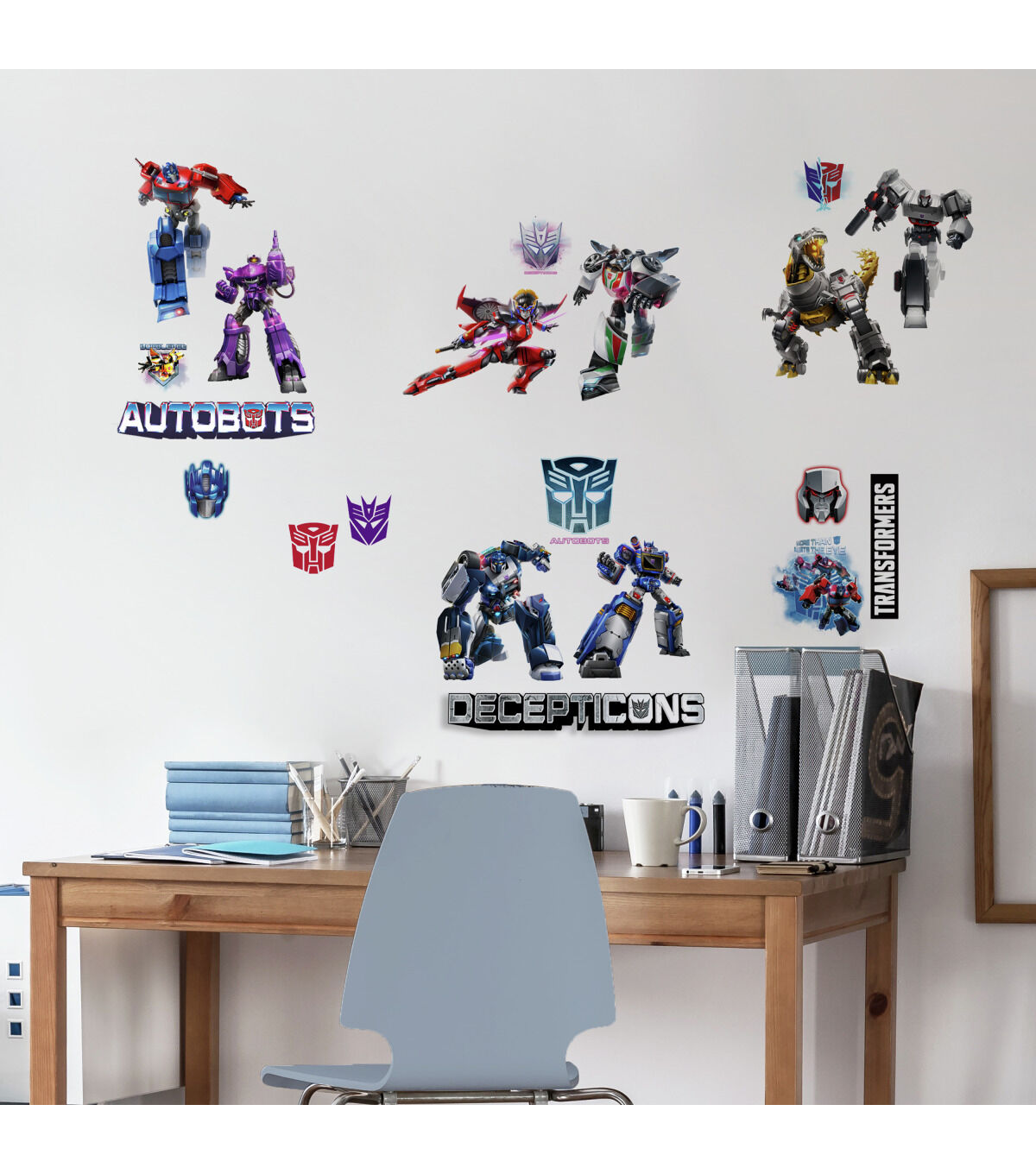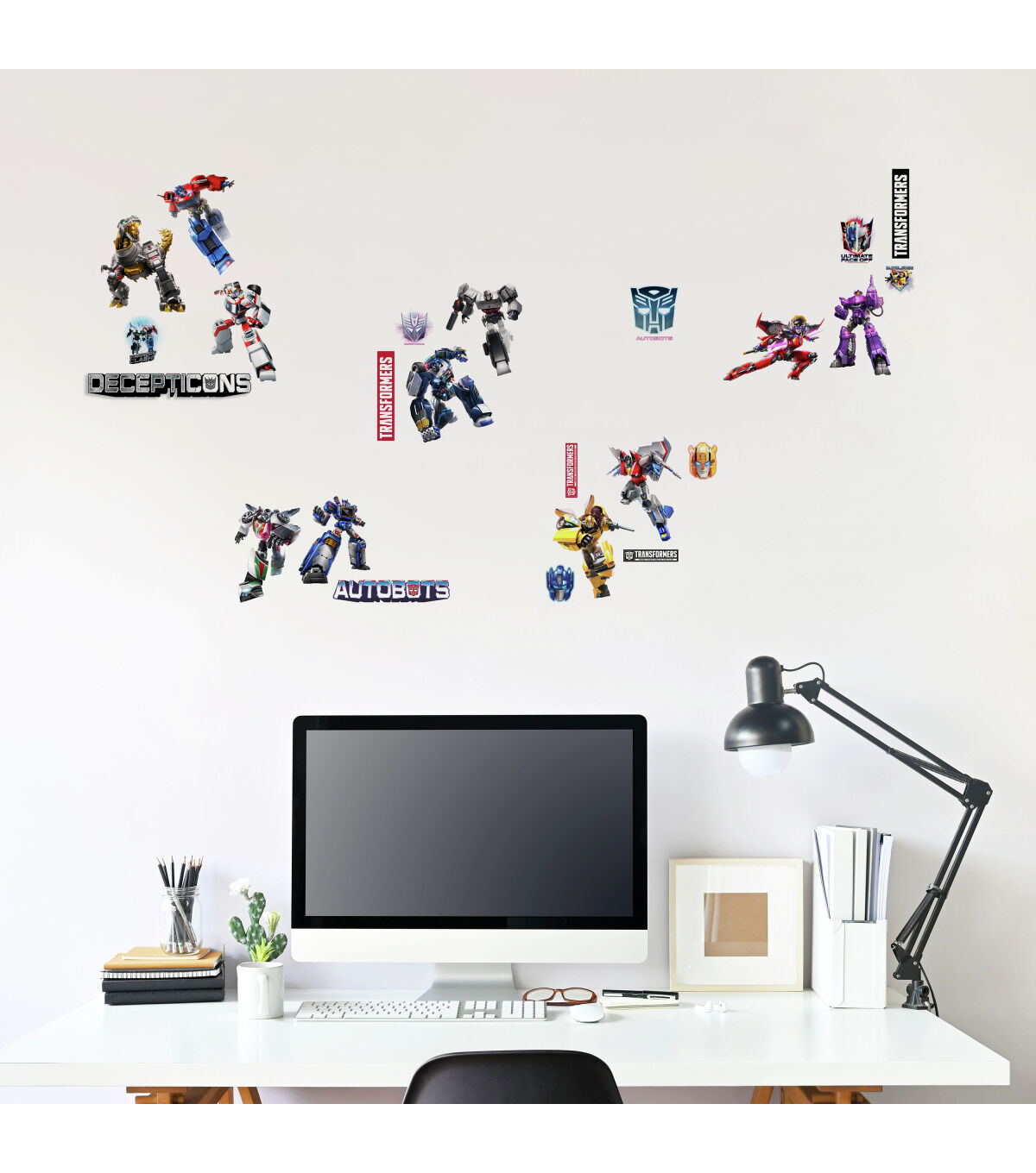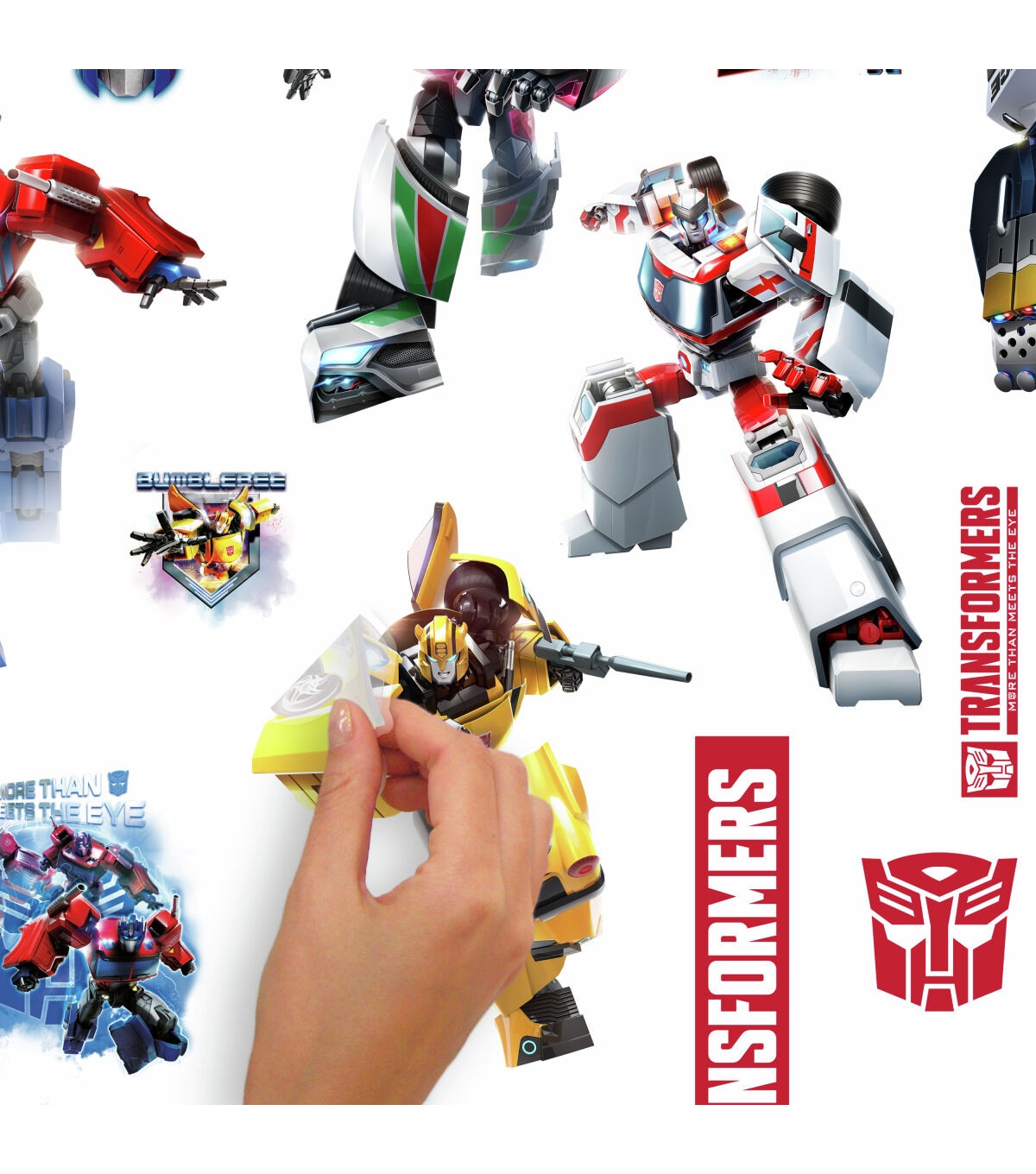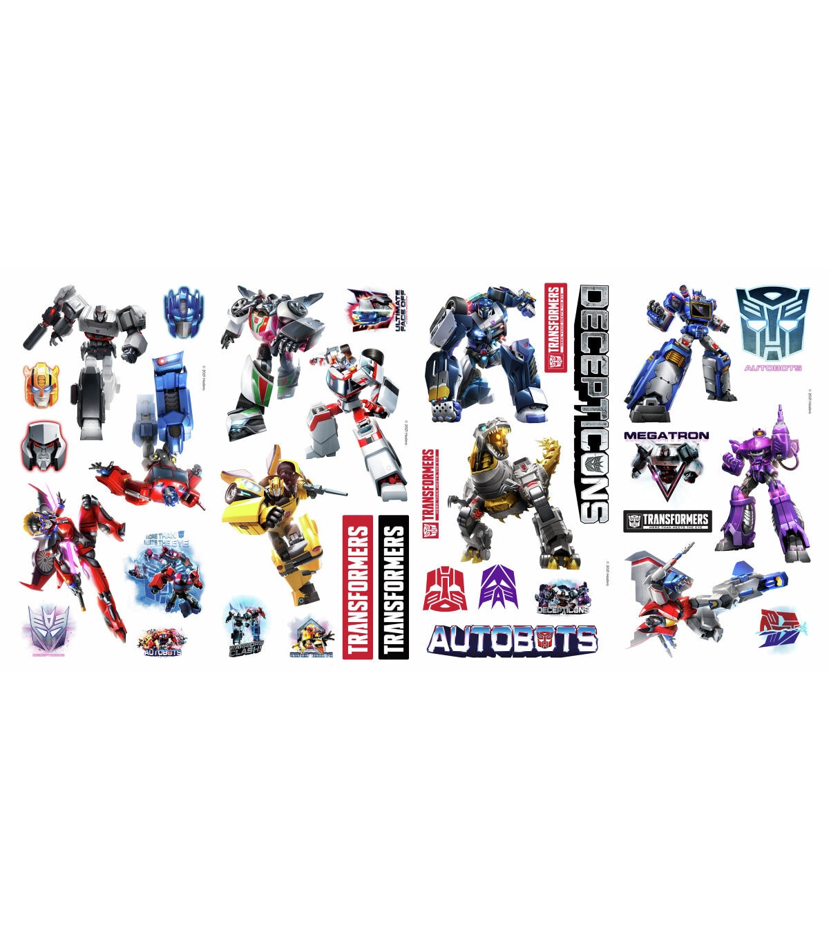 Comes with 33 Wall Decals. 2.35 inches x 1.51 inches to 1.55 inches x 10.66 inches Power up and take your battles to the next level with these Transformers Peel and Stick Wall Decals from RoomMates. Create dynamic action-packed scenes on your walls or furniture with both Autobots and Decepticons included in this officially licensed set by Hasbro. Design the ultimate Transformers-themed room by adding our Transformers Headboard Peel and Stick Giant Wall Decal (sold separately) with a set of alphabet letters allowing for full personalization. RoomMates wall decals are an easy and affordable way to decorate in minutes. Reposition or remove them effortlessly with no remaining sticky residue or damage to walls.