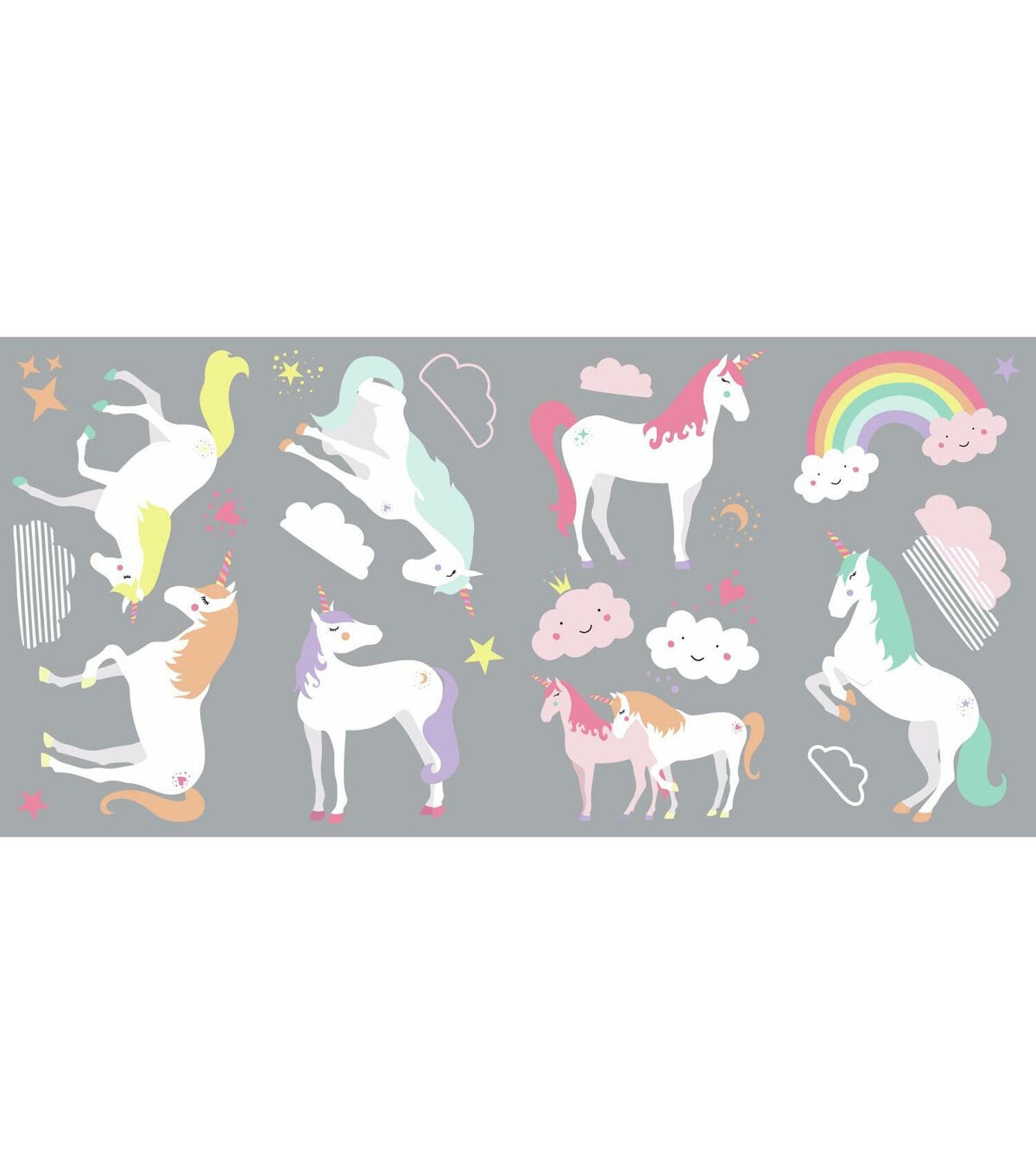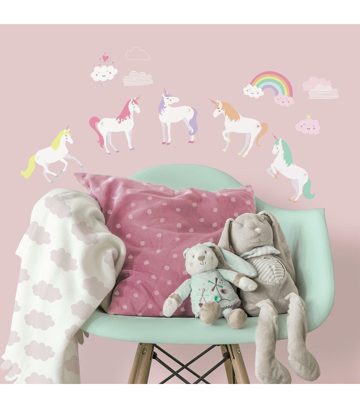 Mythical creatures become reality with 23 high-quality wall decals. Darling pastel unicorns prance with smiling clouds, bringing airy wonderment to your walls. Designed to come off without leaving a sticky residue, use wall stickers on any clean, smooth surface, from walls to furniture. Removable, repositionable and reusable, apply in seconds to bring magic to your space.