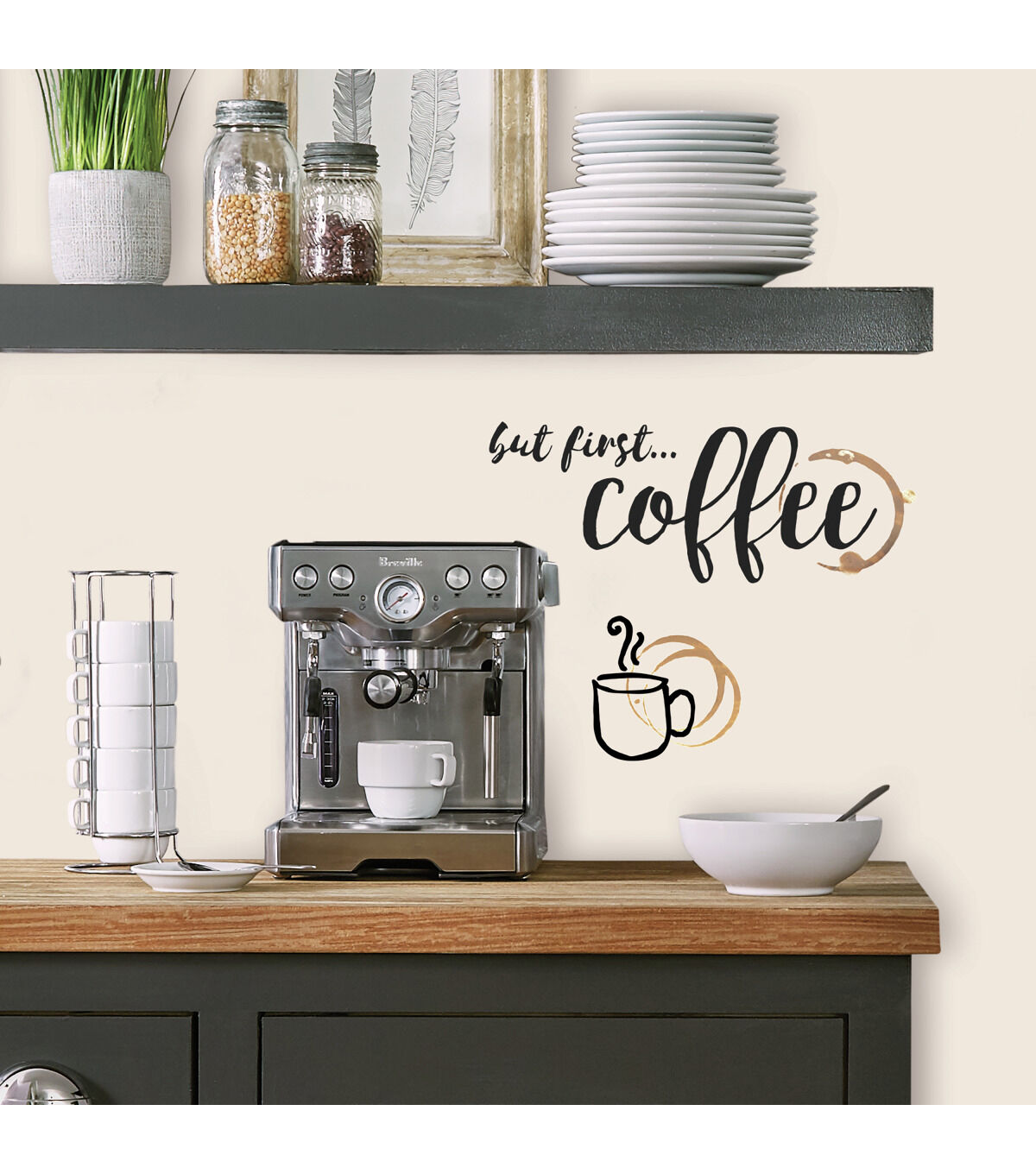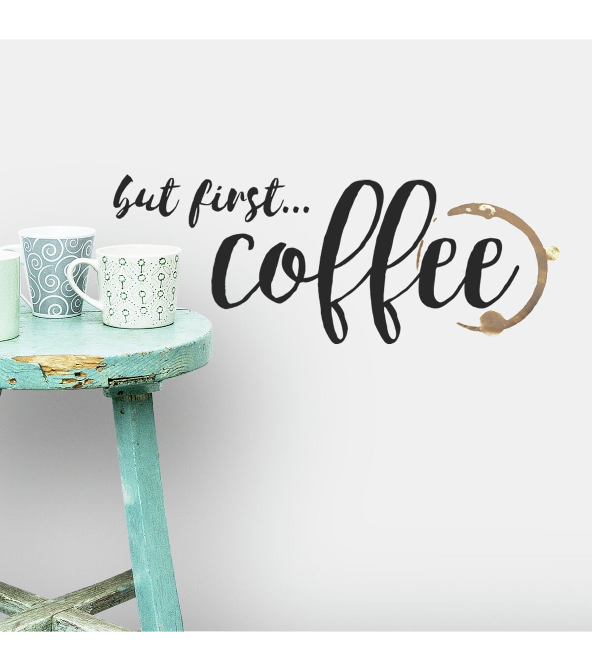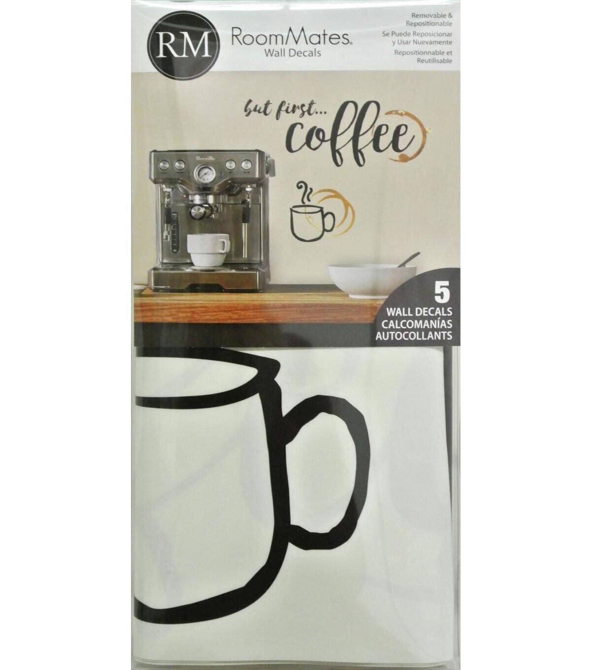 Enhance a space with But First Coffee Quote Peel and Stick Wall Decals. Simply peel and stick to any smooth, flat surface for instant results. Remove, reposition and reuse as often as needed. No sticky residue is left behind. Walls stay clean every time. ?Add personality to your walls today with RoomMates Wall Decals!