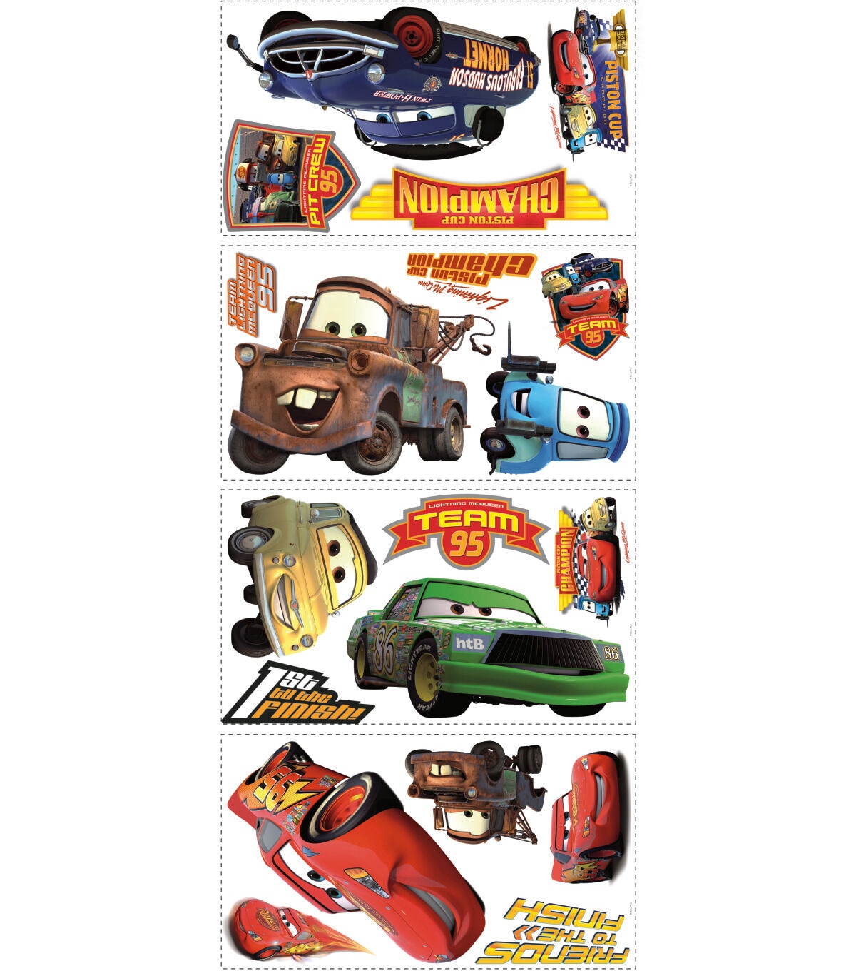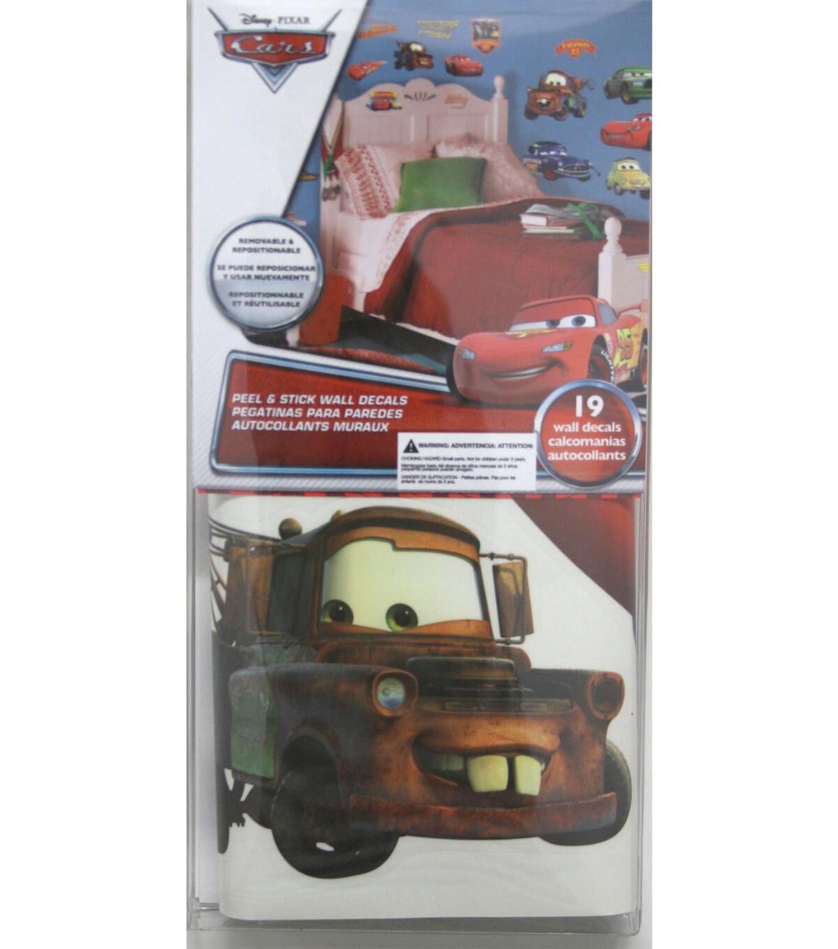 Bring the action and adventure of Disney Pixar's Cars into your childes room with these colorful wall decals. Completely removable and repositionable, these fun stickers are perfect for walls, furniture, mirrors, windows, and any other flat surface you can think of. Your little boy or girl will just love having the Cars characters in their room! Match the decals to our Cars peel & stick border, or try a giant Mater or Lightning McQueen (all sold separately) to create a Cars theme in any room!