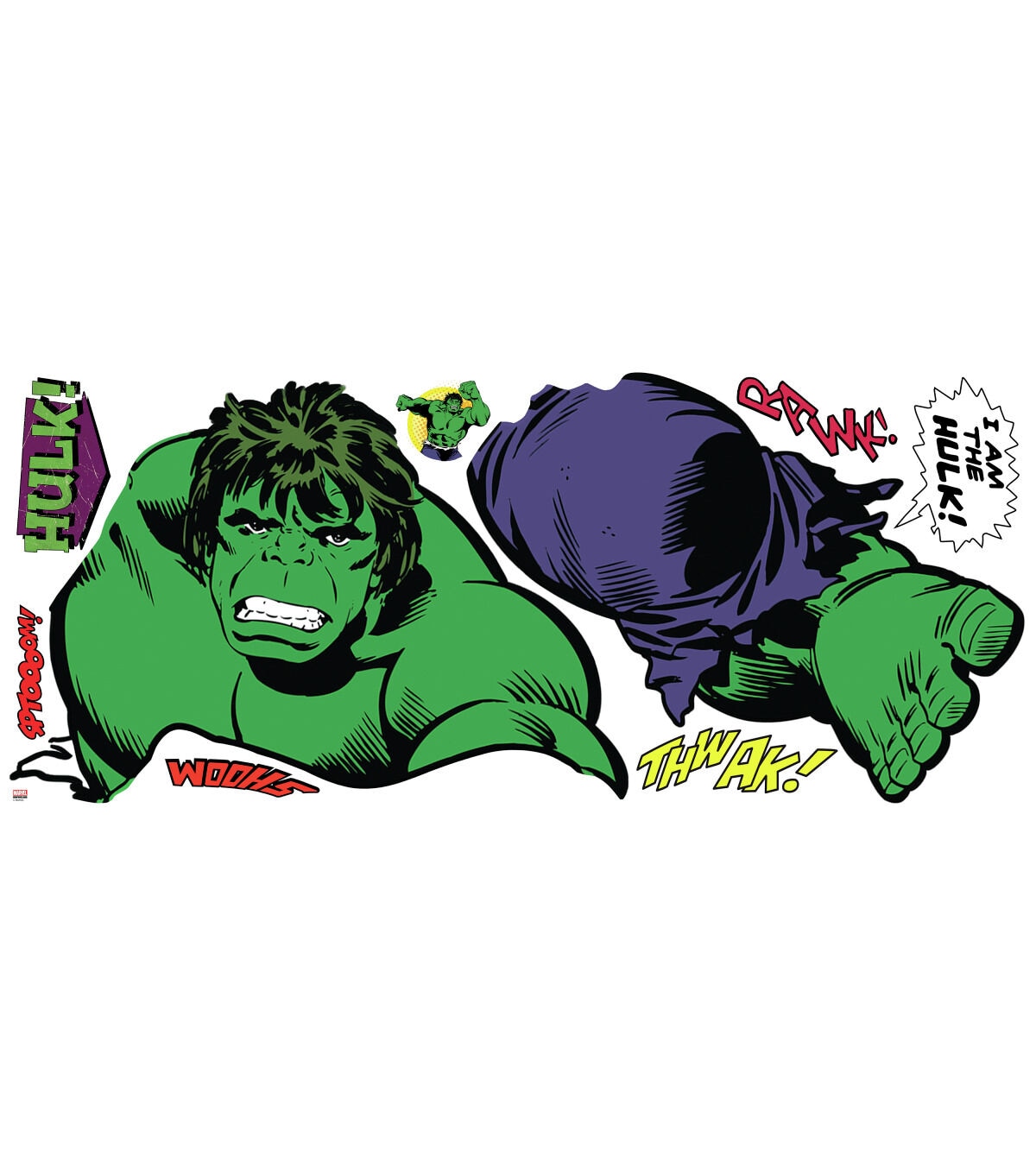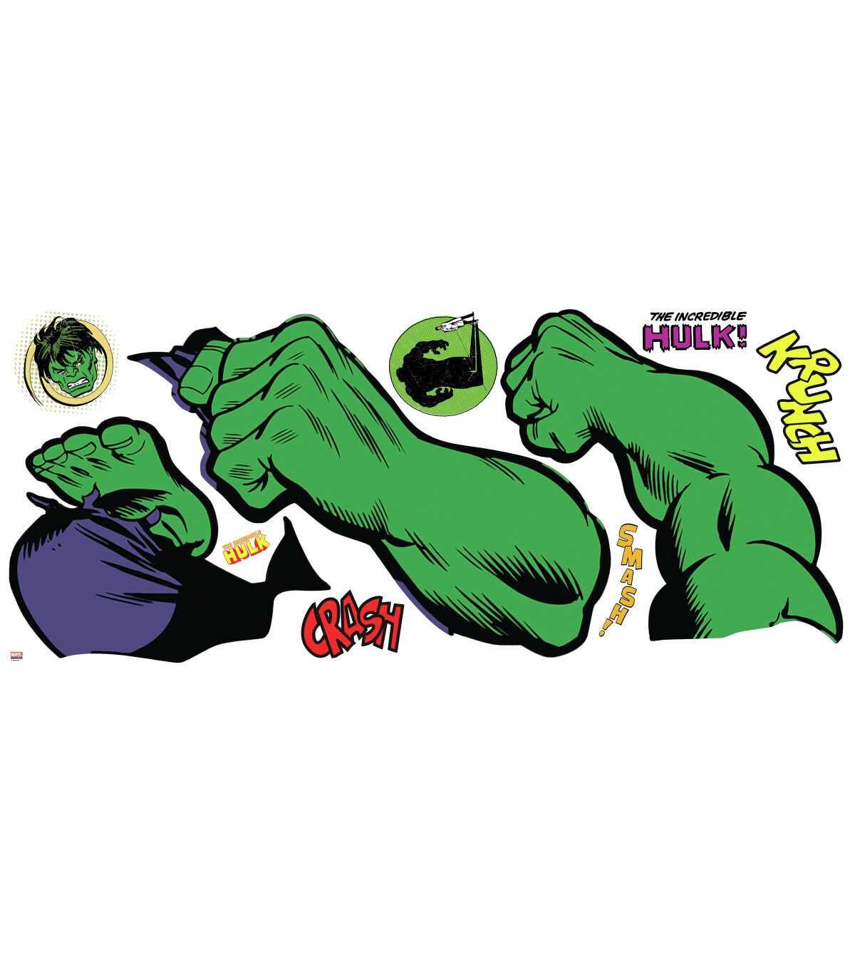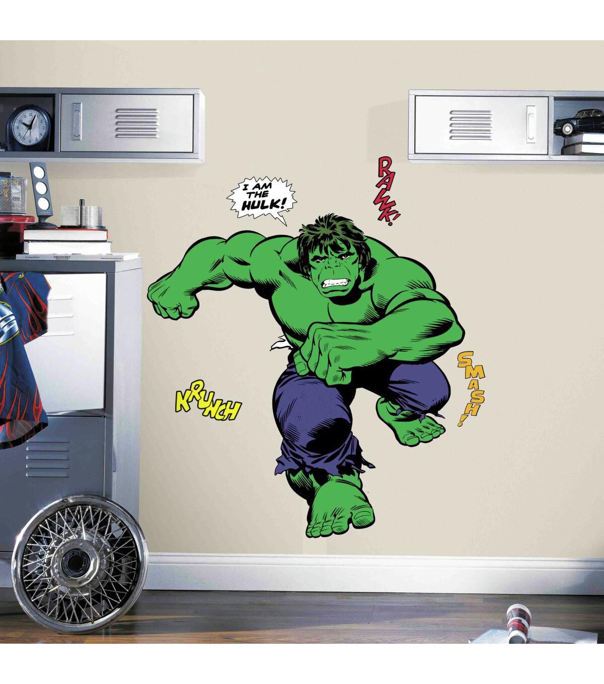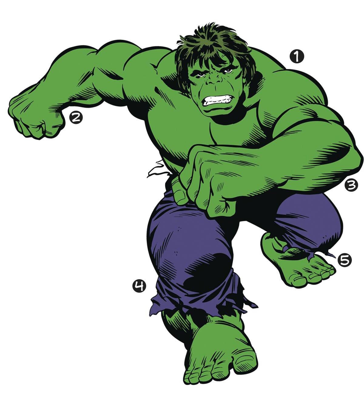 The Hulk is ready to storm your room by surprise with these Classic Hulk Comic Giant Wall Decals by RoomMates Decor. Designed with action-packed art featuring a raging Hulk ready for battle, these Classic Hulk Comic Wall Decals are fast and easy to install. Simply peel each removable and repositionable wall decal from the backing and install onto any smooth, flat surface. Your Marvel scene will unfold in minutes!