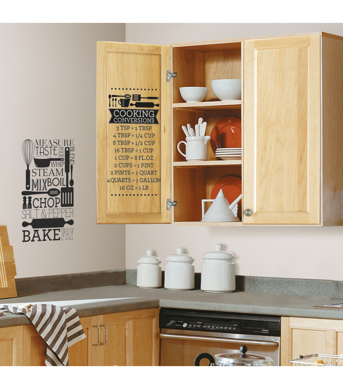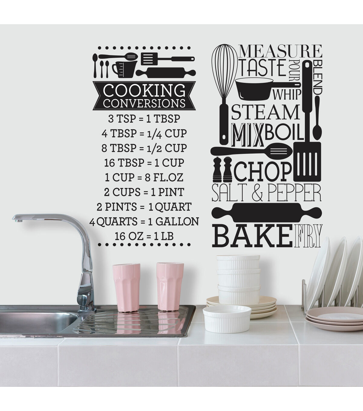 Make cooking easy with these Cooking Conversion wall decals from RoomMates. Perfect for the cook in your home, these cooking conversion wall stickers are easy to remove and reposition. To apply, remove the wall sticker from the peel and stick backing and apply to the surface of your choice. Watch your kitchen transform in minutes!