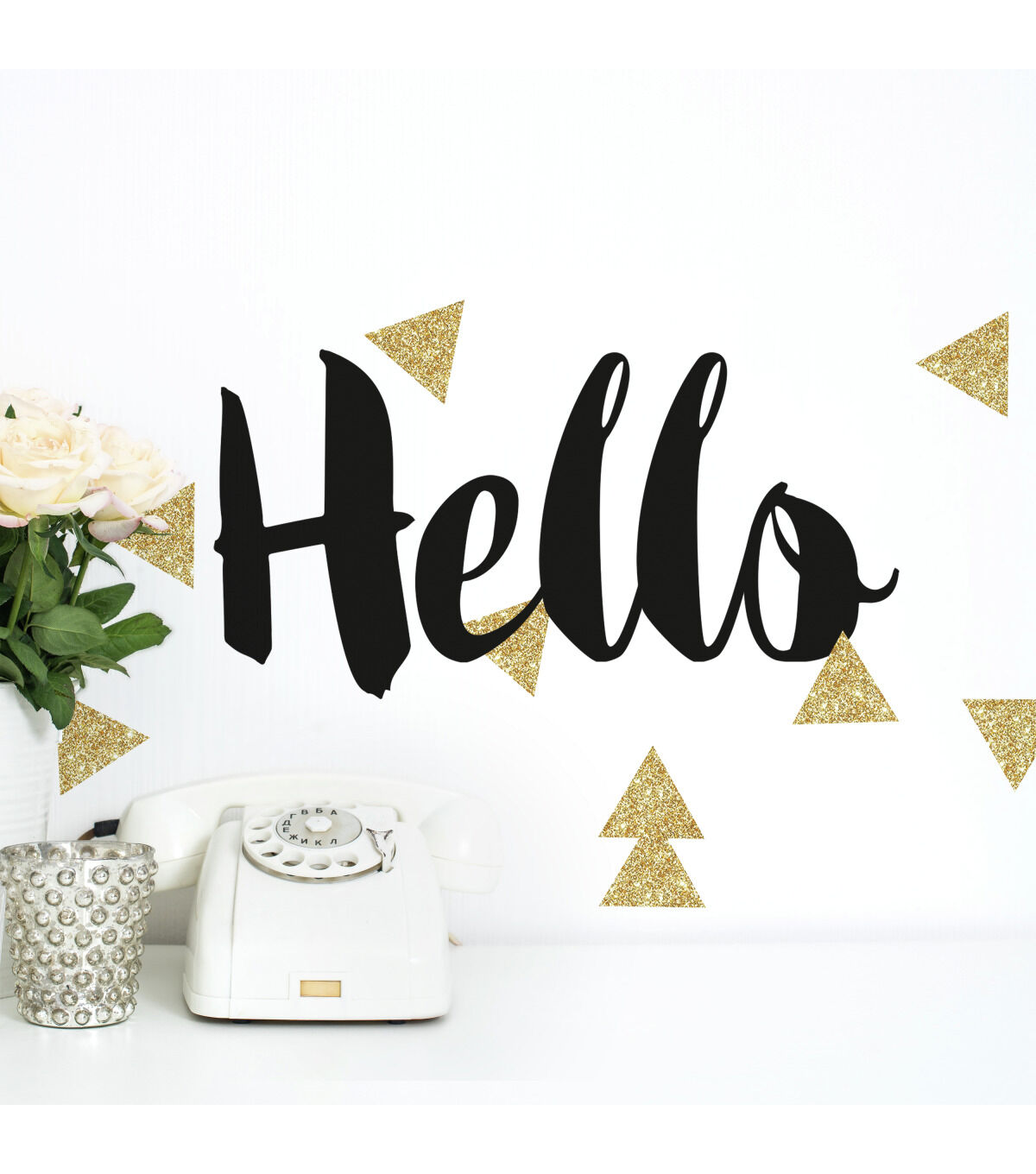 Give any room a quick makeover with Hello Quote with Glitter Triangles Peel and Stick Wall Decals by RoomMates. Featuring 17 wall stickers in all, add this decal set to any smooth, flat surface. Apply in seconds with our simple two-step process, just peel and stick. It's that easy. Plus, remove, reposition and reuse while keeping walls residue and damage-free every time. Makeover your room in an instant with RoomMates!