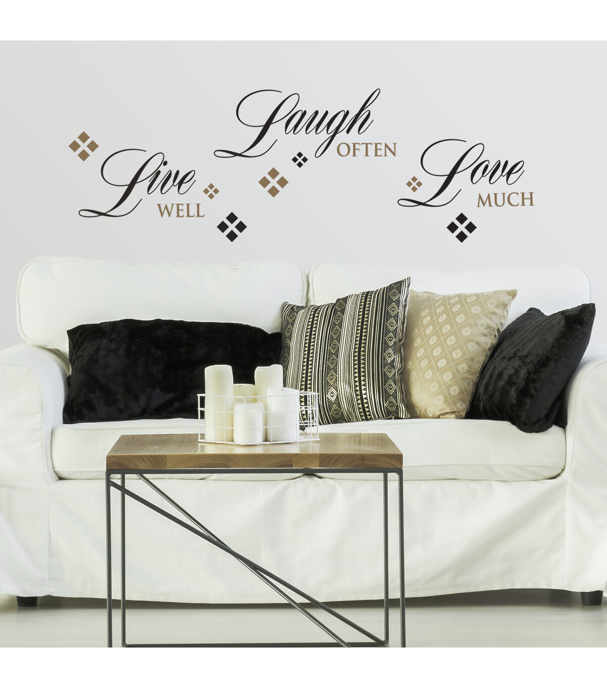 Encourage the things that matter most with these 'live well, laugh often, love much' wall decals. Applying is easy: just peel and stick. Perfect for the living room, bedroom, or hallways'nearly anywhere that a flat surface is available. And if you ever need to move things around, there's no sticky residue to worry about.