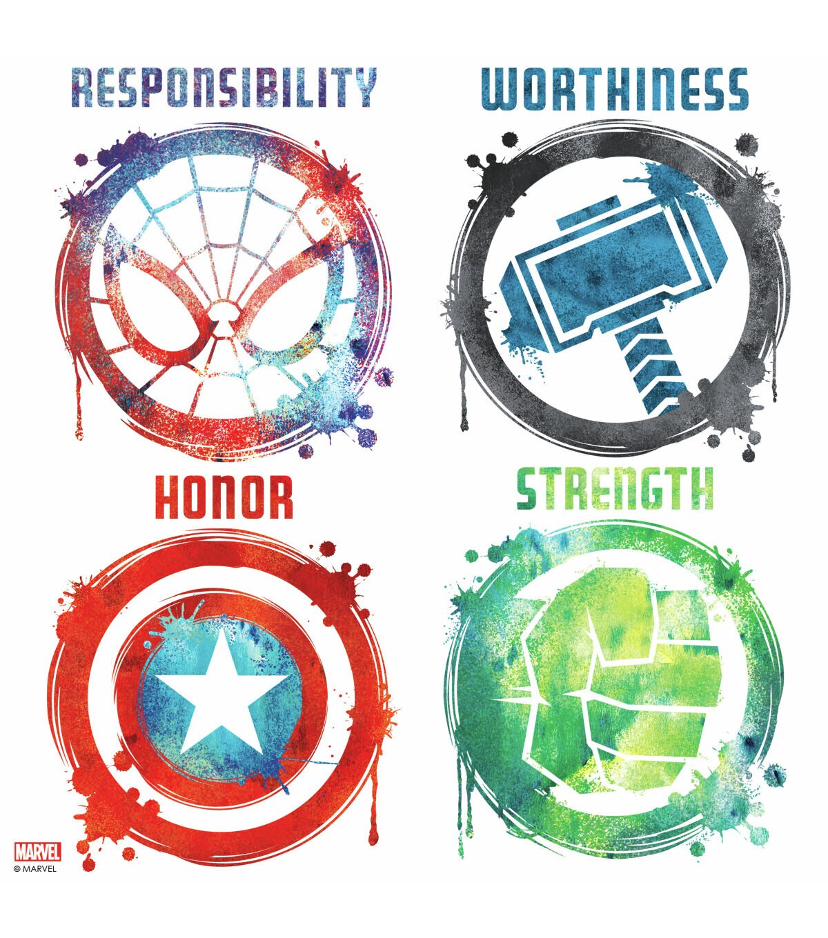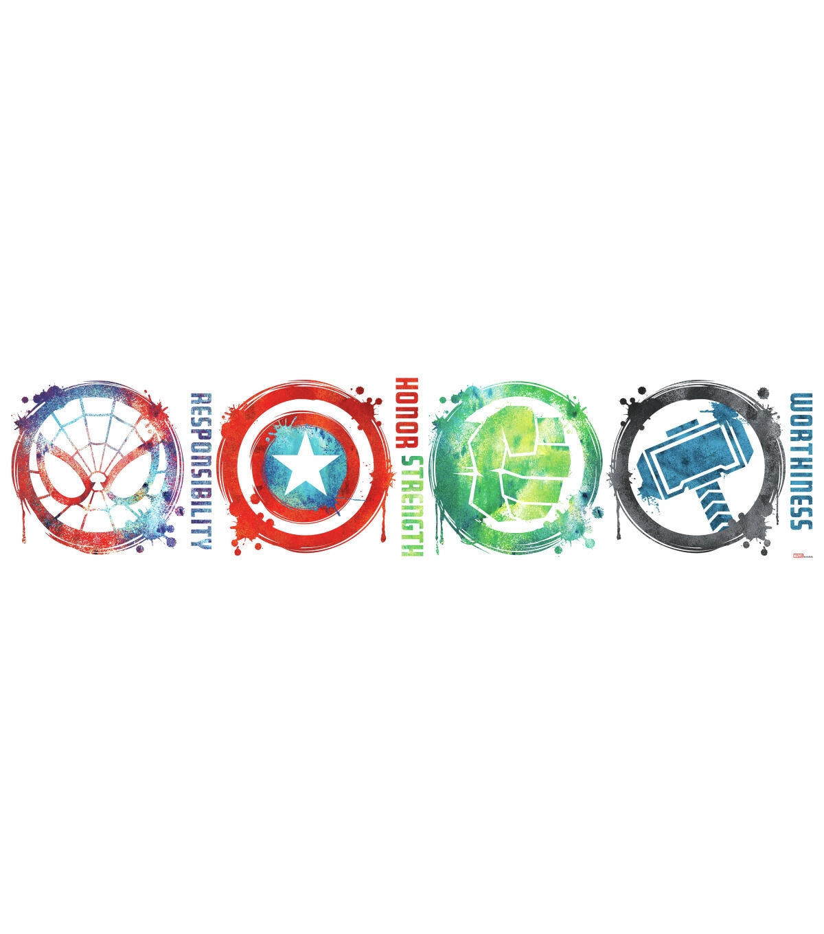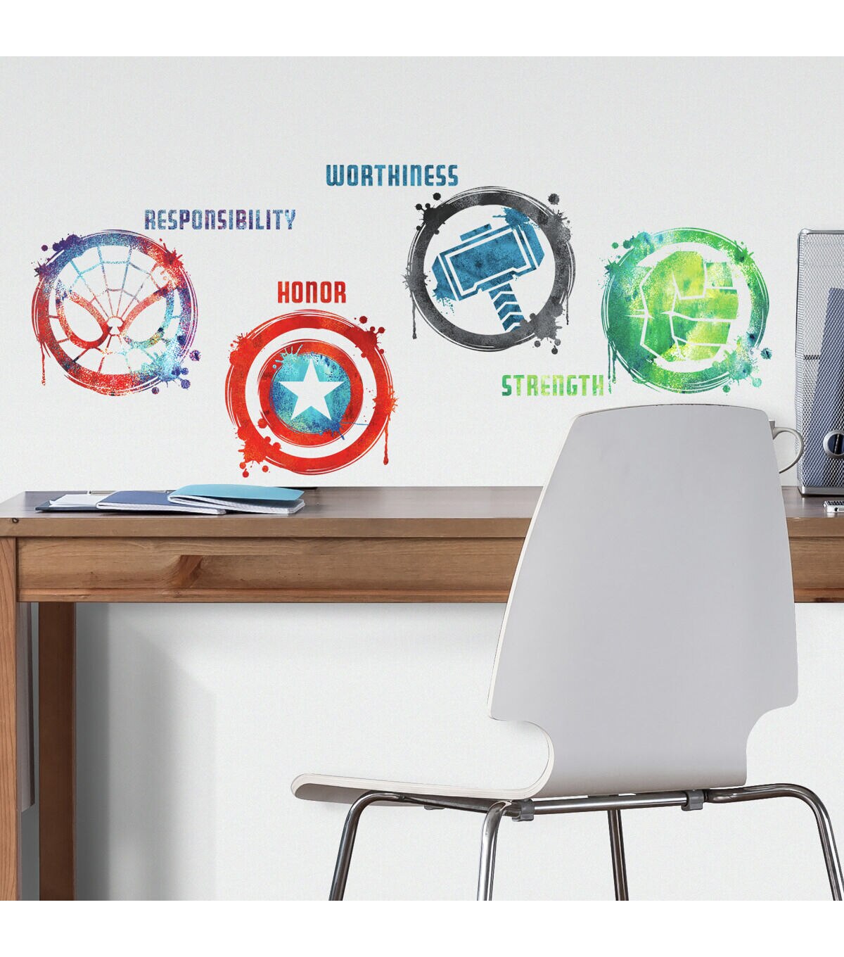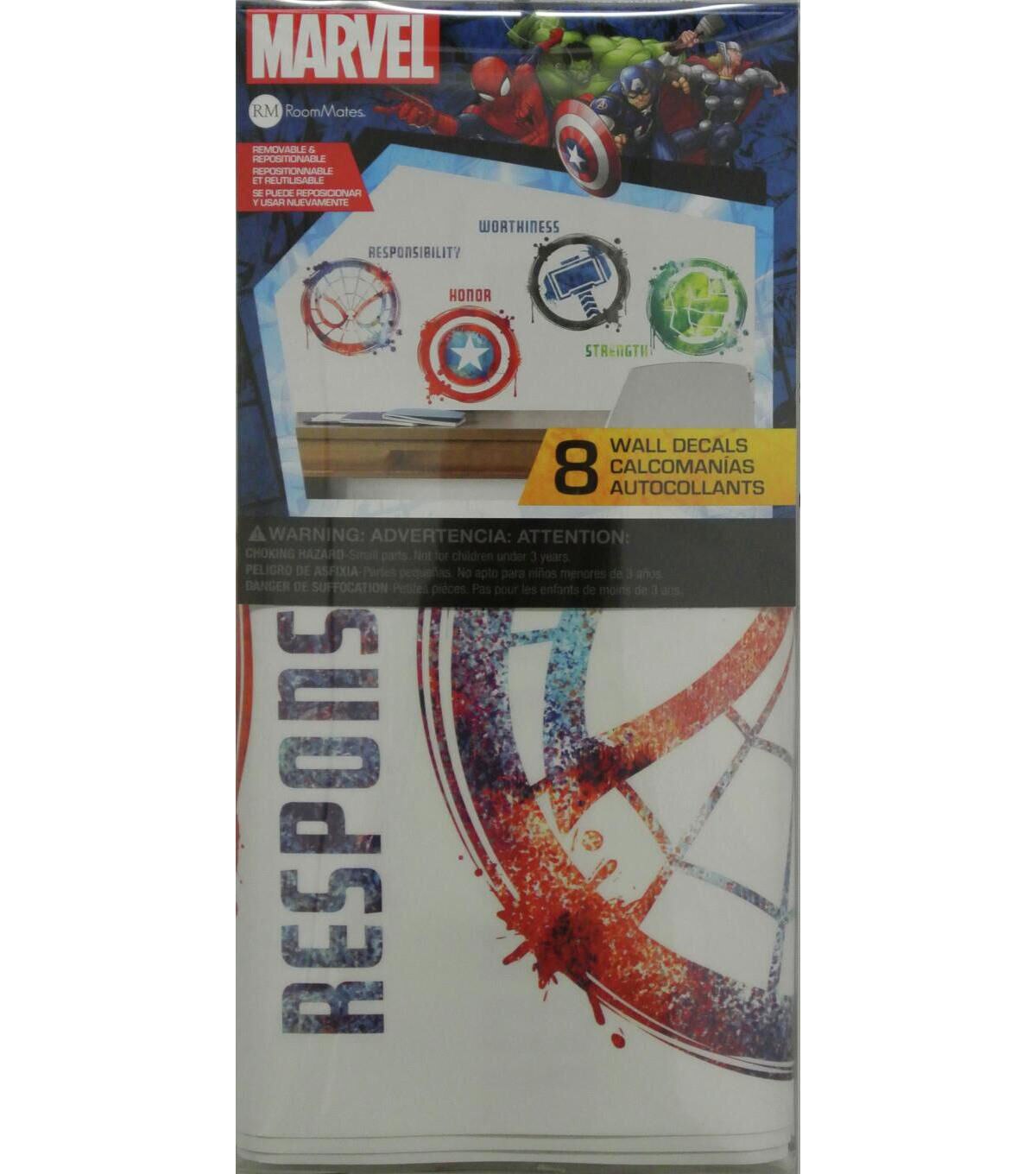 Update a space with RoomMates Marvel Icons Peel and Stick Wall Decals. Complete with eight wall decals, it?s glow in the dark! Great for any bedroom, game room and more, simply peel and stick to any smooth, flat surface for instant results. Remove, reposition and reuse as often as needed. No sticky residue is left behind. Walls stay clean every time. Add personality to your walls today with RoomMates Wall Decals!