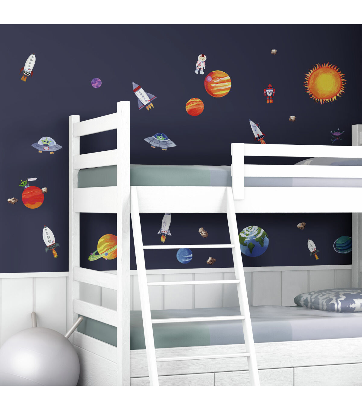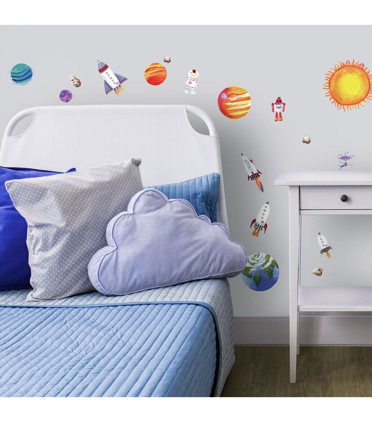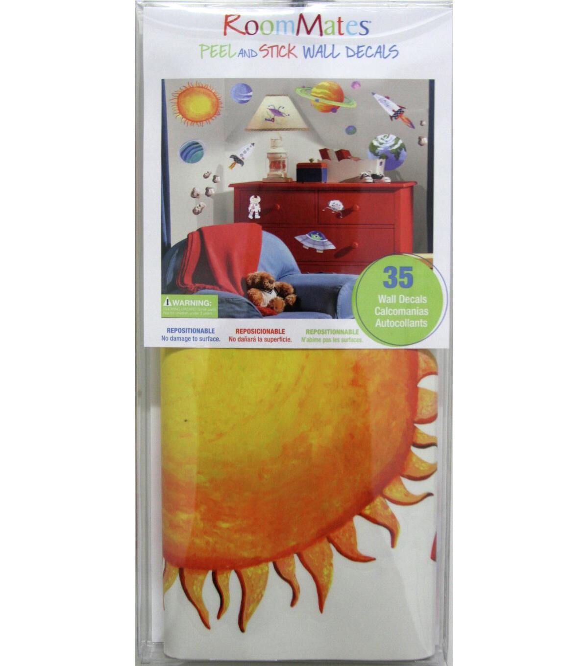 Let's take a rocket to a galaxy of brightly colored planets and meet some friendly aliens and robots along the way. Create your own Outer Space scenic mural with this set of repositionable wall stickers. Jump on board the spaceship of your choice and explore the universe... all on your walls! And whenever you're ready for a new adventure, you can move the designs around and start all over again.