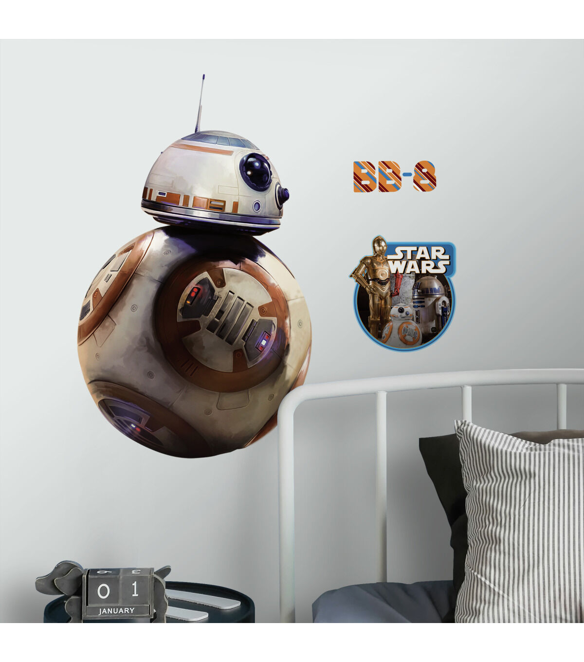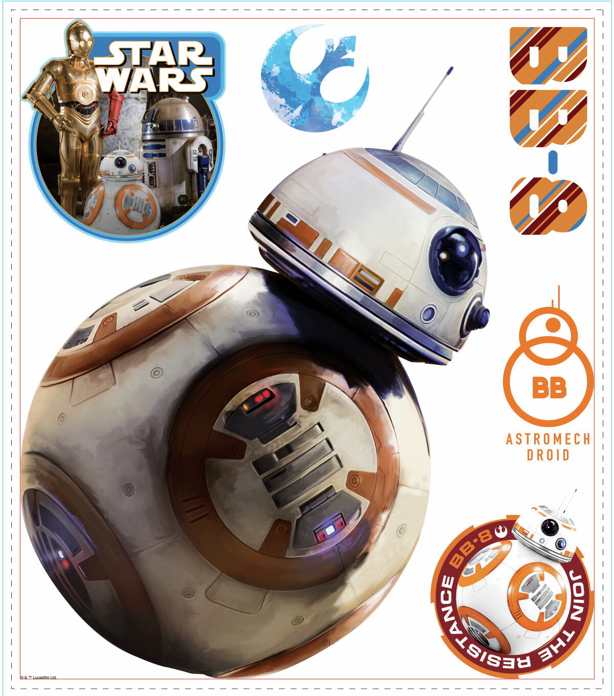 Build your favorite droid from Star Wars Ep VII on your walls with this Star Wars Ep VII BB-8 PEEL AND STICK Giant Wall Decal from RoomMates decor. Mostly white with a silver and orange body, peel and stick to any smooth, flat surface and watch Star Wars Ep VII's BB-8 come to life!