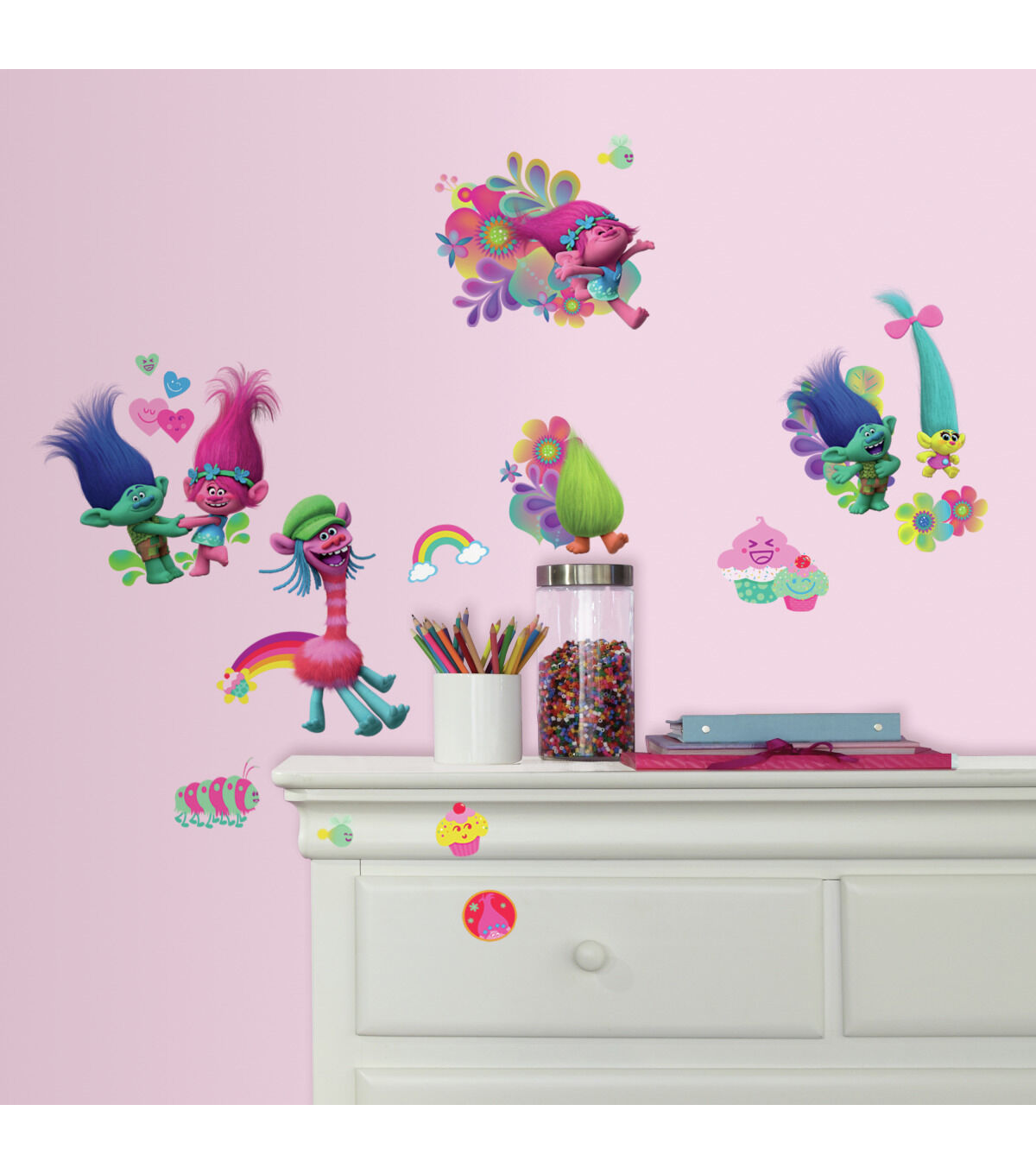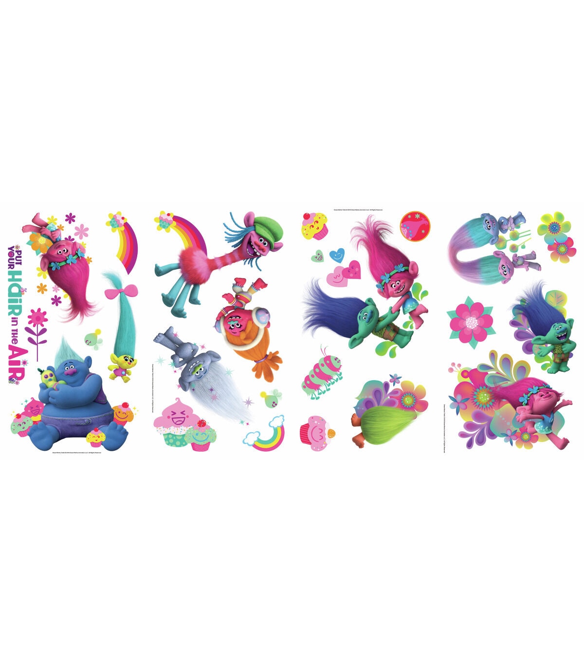 Looking for a source of joy? Find your true colors with our Trolls Wall Decals by RoomMates Decor. This wall decal is guaranteed to make your little one sing and dance. Full of colorful fun, this wall decal set comes with twenty-seven wall decals featuring all of your favorite characters from the movie - enough to decorate an entire space. The perfect decor for any bedroom, playroom or even Trolls-themed party, add these wall stickers to smooth, flat surface including walls, furniture and much more. Our innovative peel and stick technology makes the application process easy. Simply peel each wall sticker from the backing and apply to the surface. Plus, remove, reposition and reuse each wall decal over and over again without any damage to the surface or sticker. Decorate with Trolls Wall Decals today!