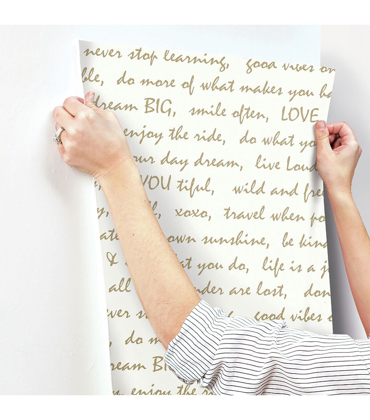Simply chic, update your space with Gold Dream Big Script Peel and Stick Wallpaper by RoomMates. Offering a fun and fresh way to decorate, Peel and Stick Wallpaper is printed on high quality vinyl that is repositionable and removable, making it a go-to, budget-friendly choice for both temporary and permanent projects. Perfect for accent walls, furniture, backsplashes, DIY decor, and more, simply peel and stick to install. Completely easy, create endless style-worthy possibilities with RoomMates Peel and Stick Wallpaper.