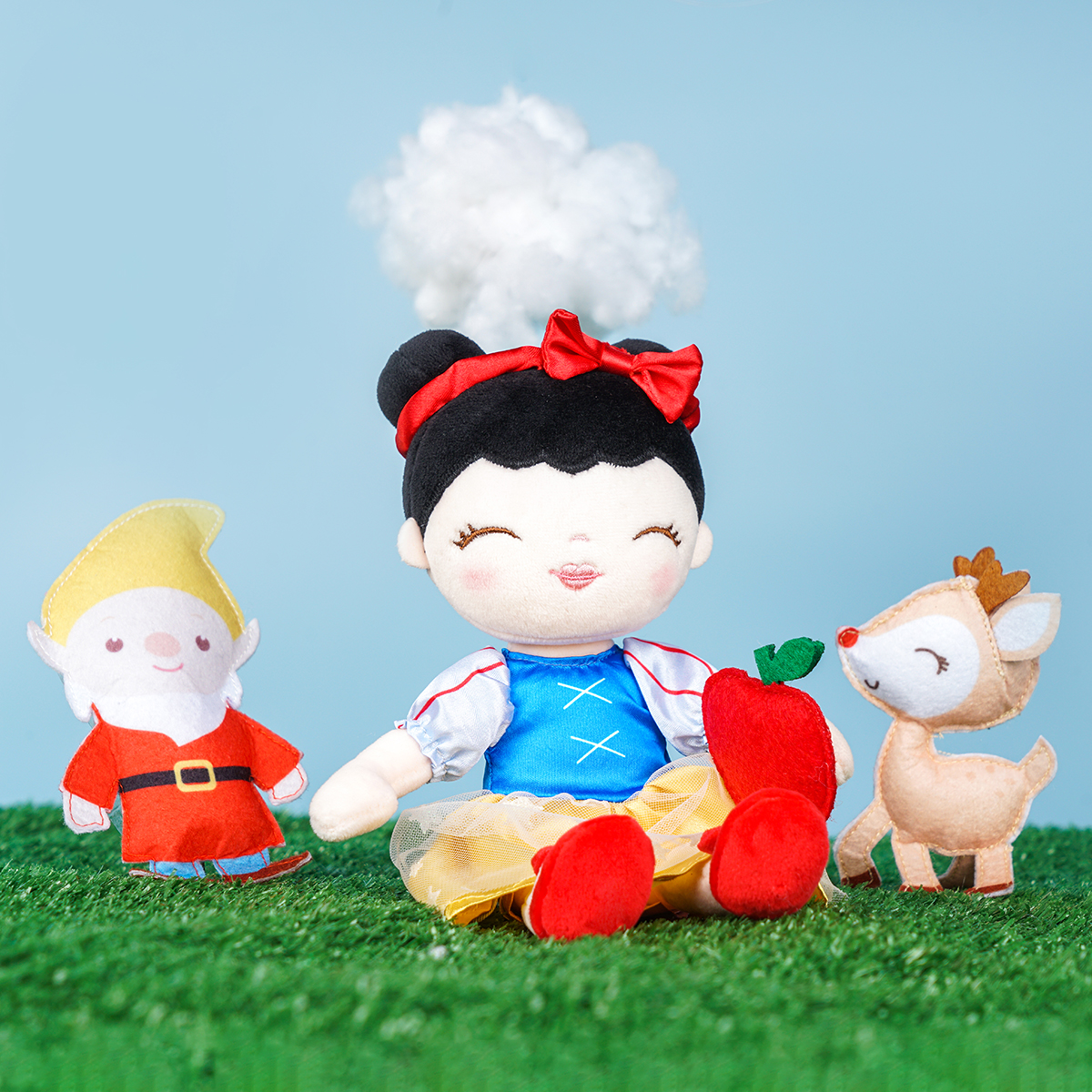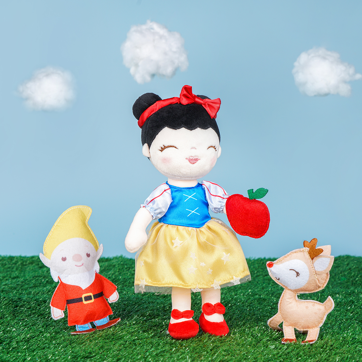 2.Four-piece playset items: a snow princess doll with two dresses and a red hairband; an apple, a sika deer, and a dwarf felt toys.