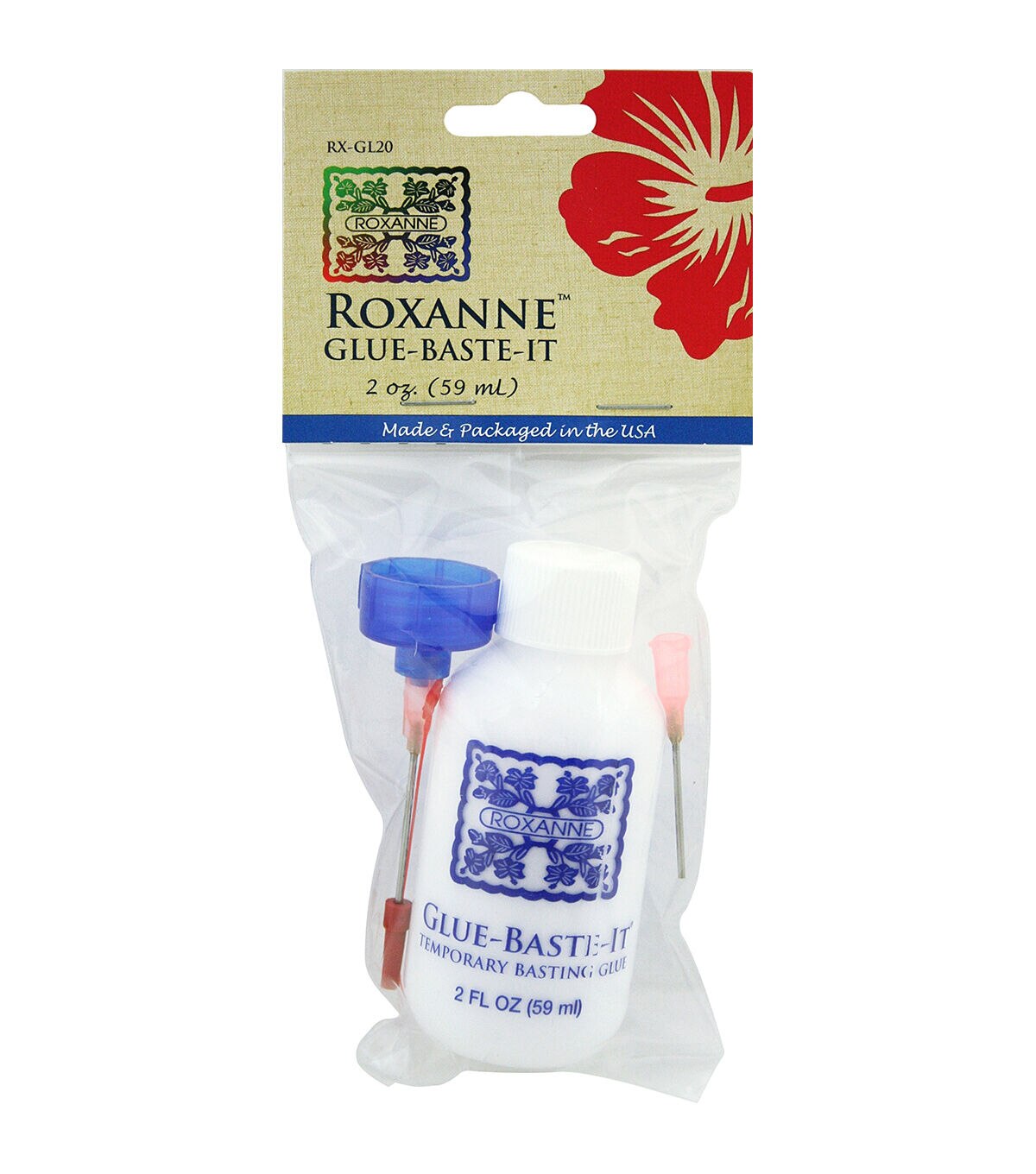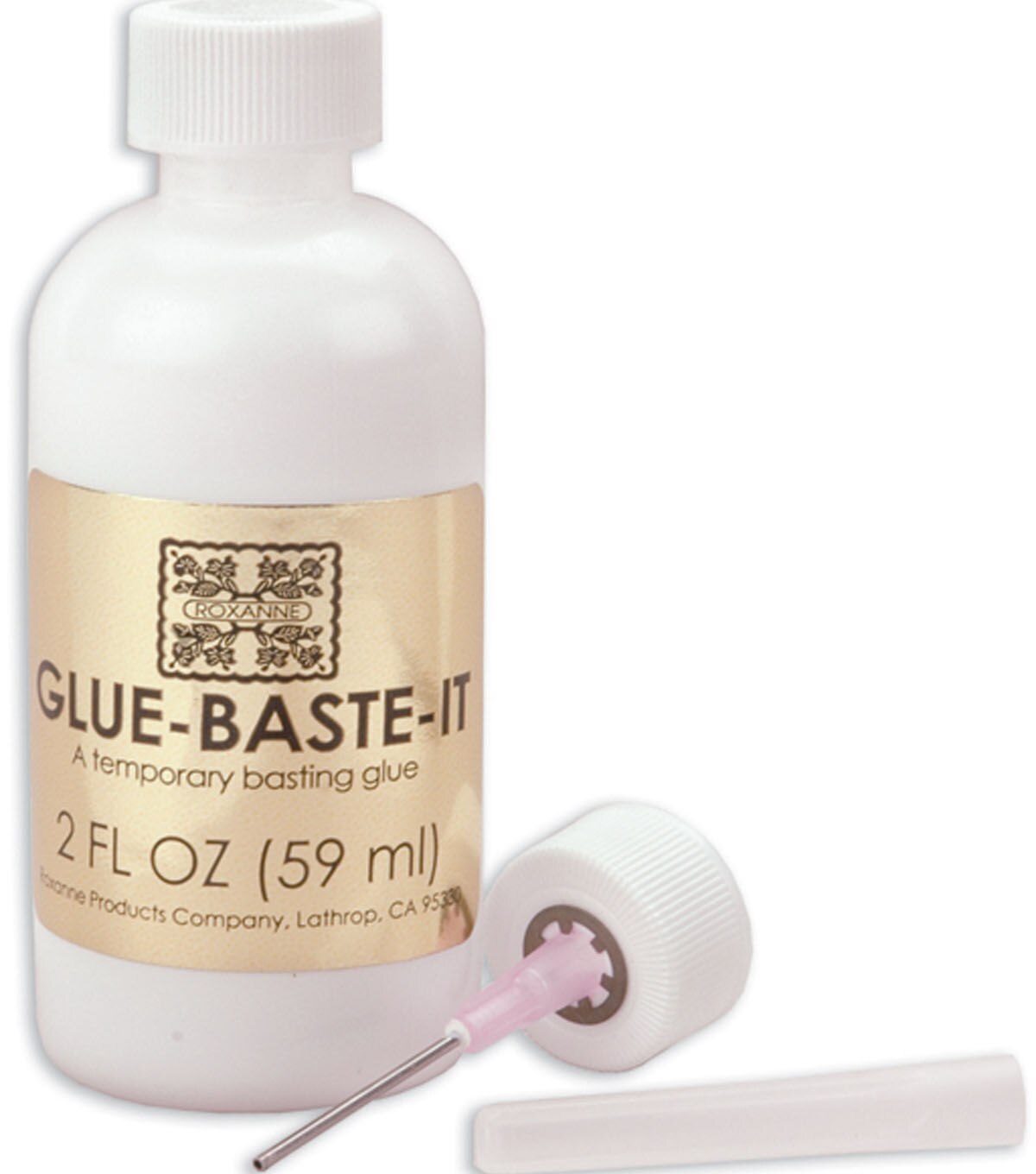 Use the Roxanne Glue-baste-it Temporary Basting Glue to temporarily baste fabric. It is water soluble and does not feel stiff when dry. This pack contains a 2-ounce bottle of basting glue and two syringe tips. You can use it for attaching appliques to fabric surfaces, quilt bindings and other projects that require a firm, temporary hold.