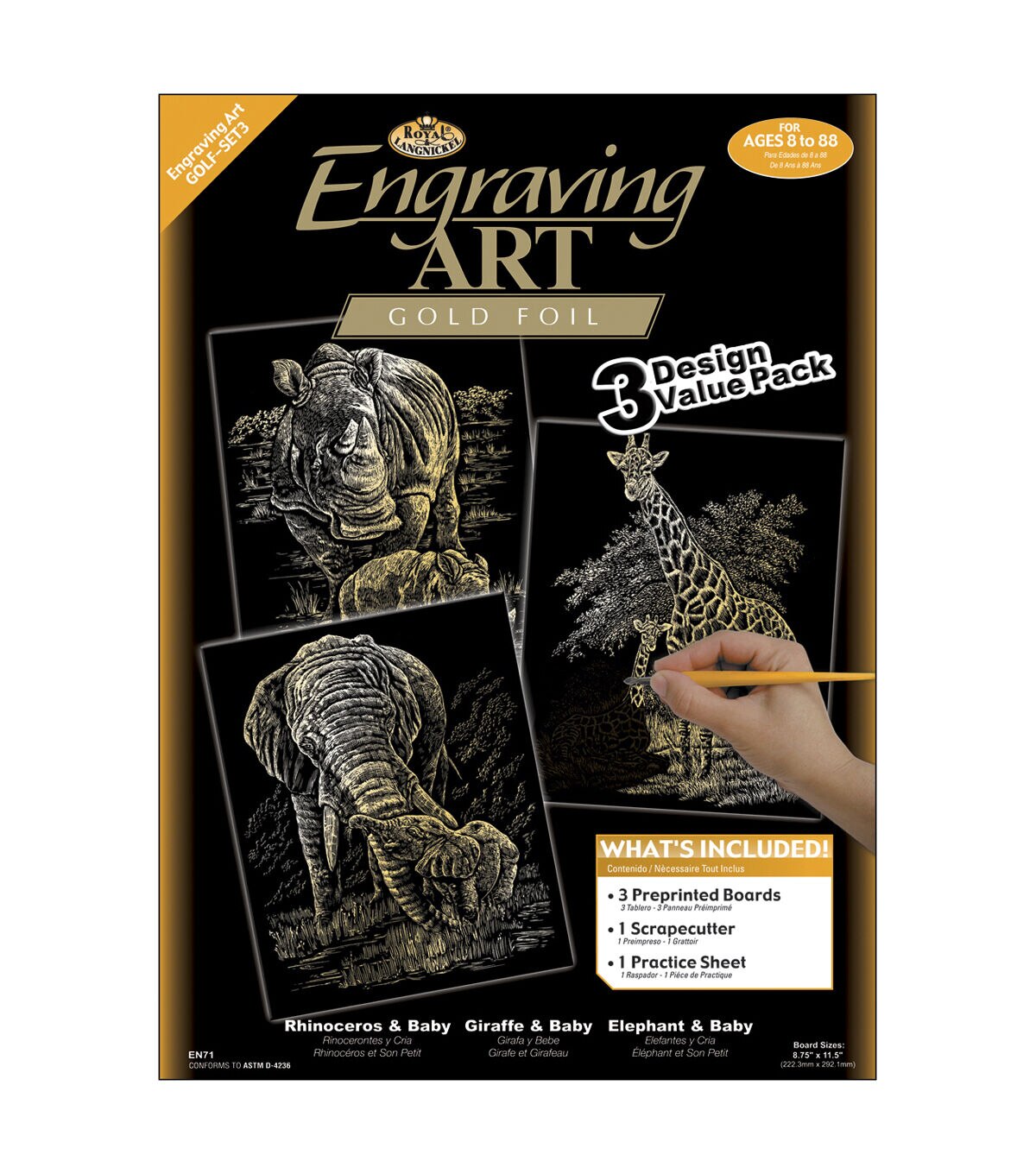 • Royal Brush Engraving Art Value Pack 3PK Rhinoceros, Giraffe, Elephant