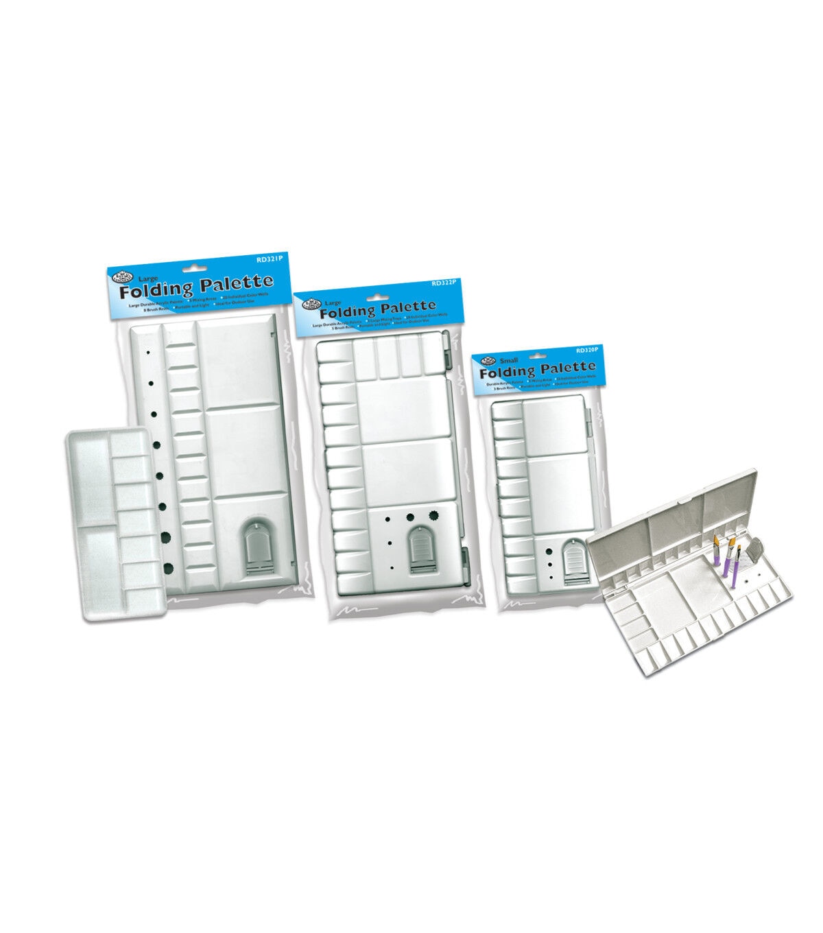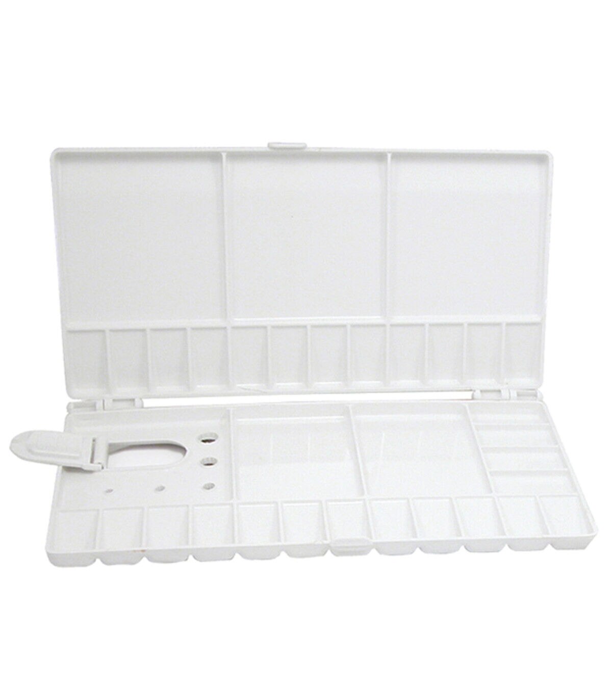 This palette is ideal for all types of paints; hinged in the center, it folds and locks easily for compact and secure travel or storage.