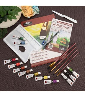 - CONTENTS - 12 silky watercolor paints, 4 assorted brushes, a graphite pencil, eraser, sharpener, palette, palette knife, a Watercolor Artist Pad, and instructional booklet