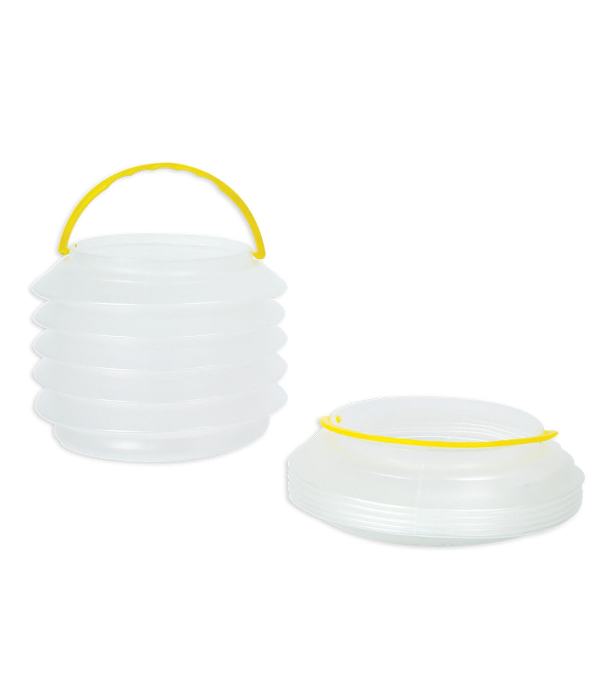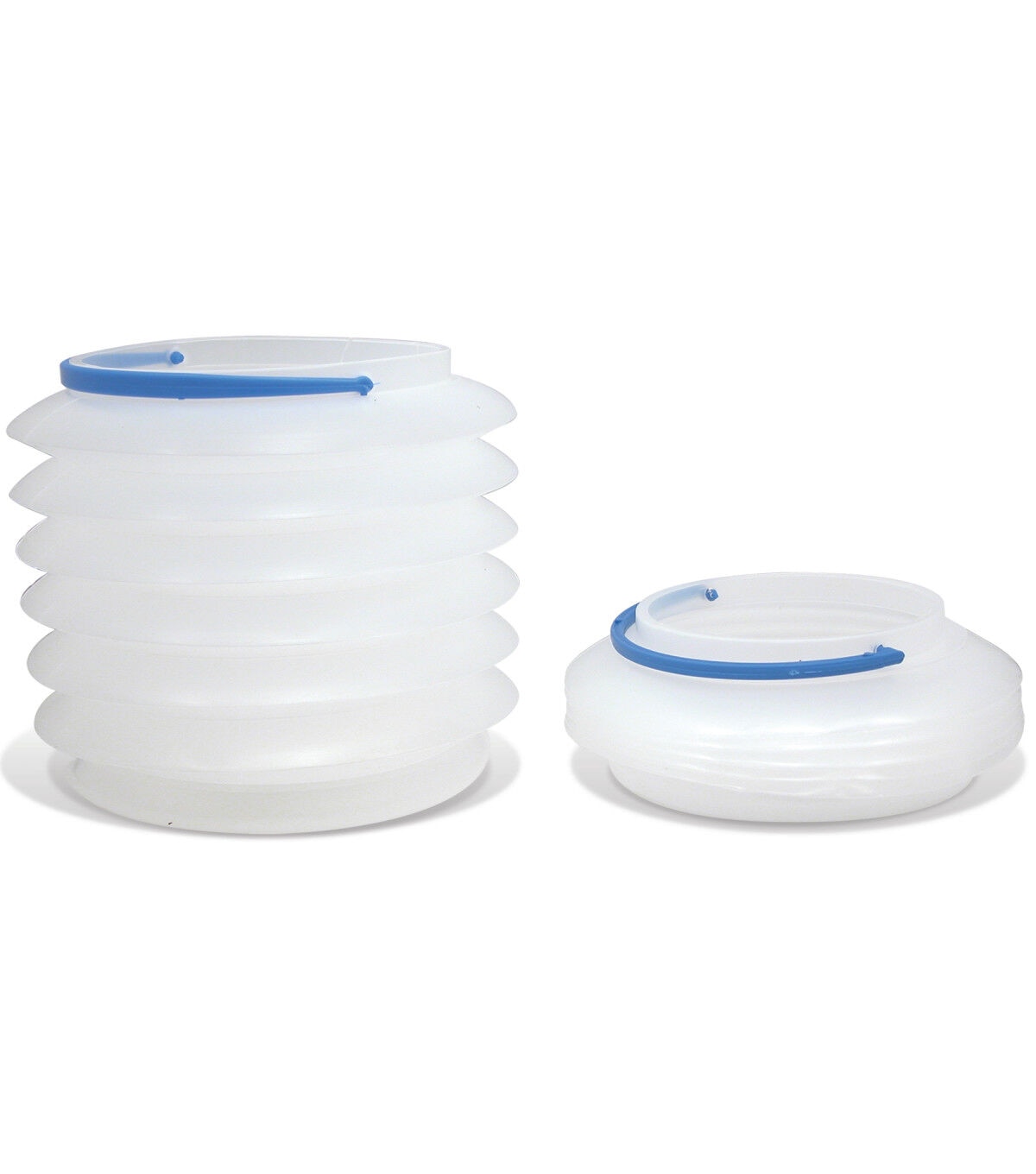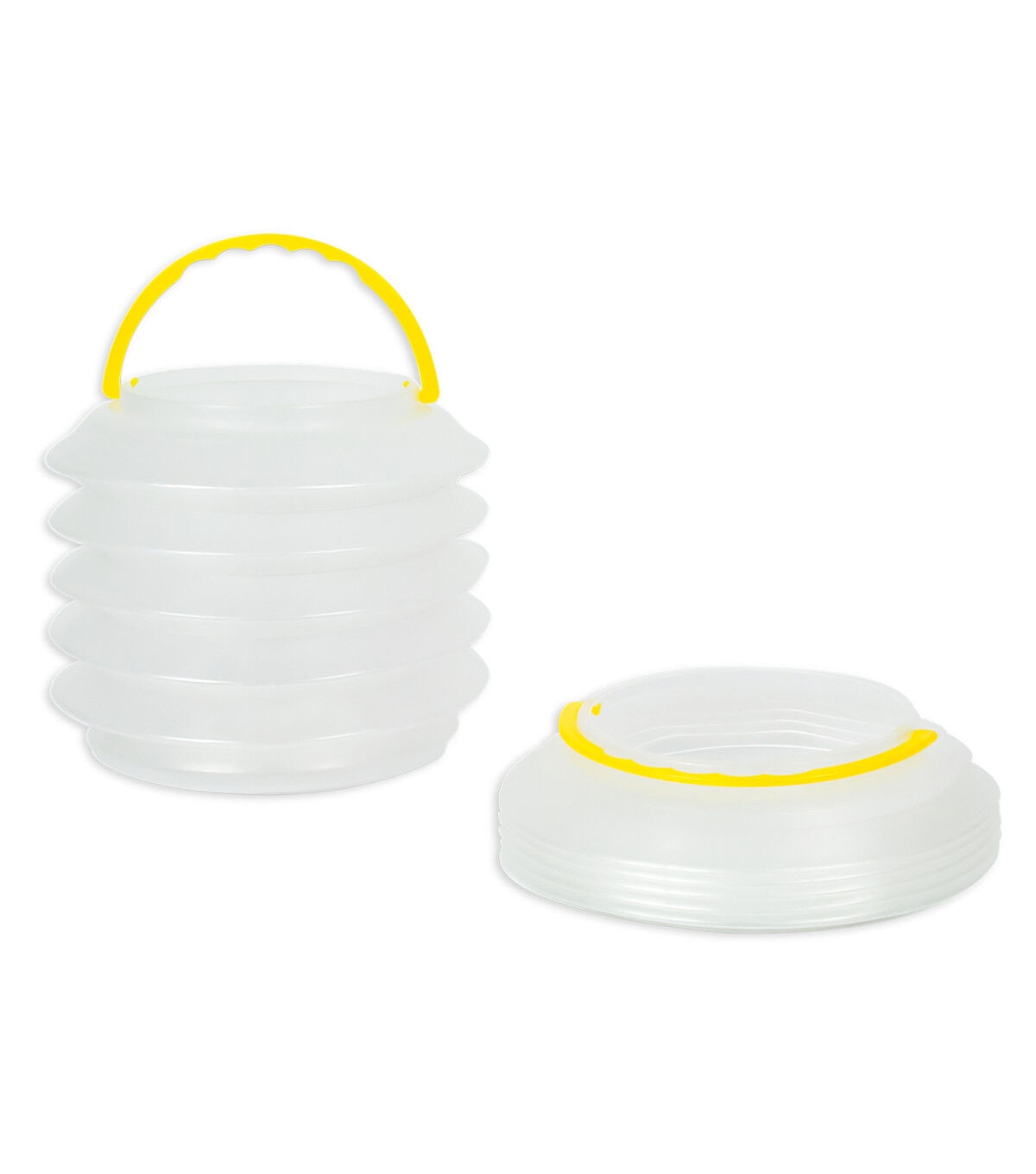 The travel brush washer has accordion-like sides that collapse almost flat for easy, compact transport.