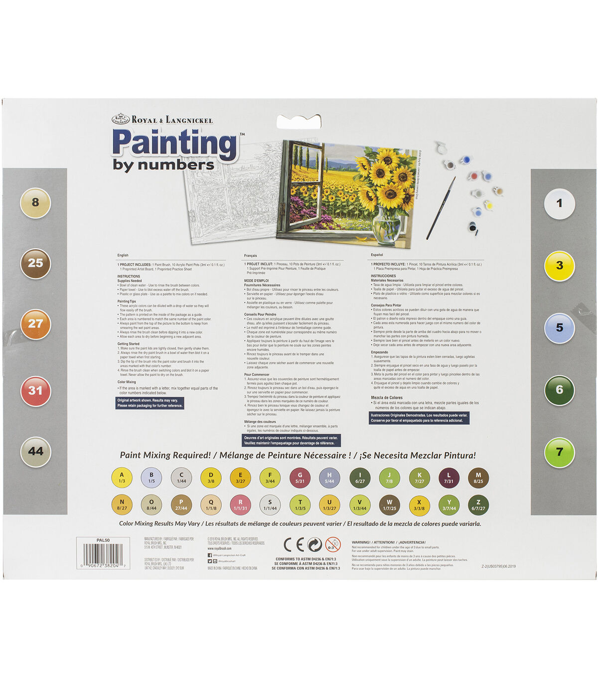 ROYAL BRUSH-Adult Large Paint By Number Kit. These designs offer more complex artwork giving you the challenge and outcome you are looking for. These kits contain one 15-3/8x11-1/4in pre-printed artist board, one pre-printed practice board, ten acrylic paints, brush and instructions. Available in a variety of themes. Conforms to ASTM D4236. Recommended for children ages 8 and up. WARNING: Choking Hazard-small parts. Not for children under 3 years. Imported.