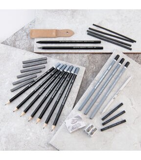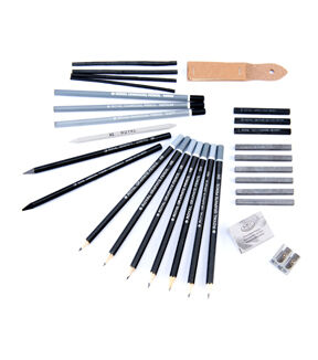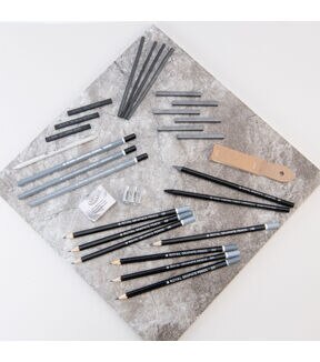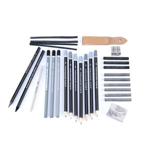 - Set includes: 6 graphite pencils, 6 sketching sticks, 4 vine charcoal, 3 charcoal pencils, 3 charcoal sticks, 1 sanding block, 1 woodless graphite pencil, 1 woodless charcoal pencil, 1 sharpener, 1 blending stump, 1 kneadable eraser
