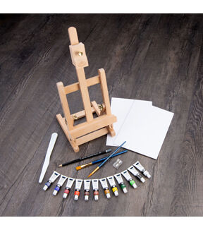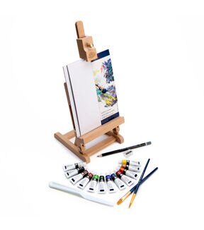 - CONTENTS - 12 bold acrylic paints, 2 Artist Boards, 2 Gold Taklon brushes, a palette knife, graphite pencil, sharpener, and one H Table Easel
