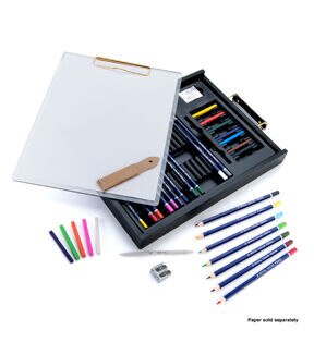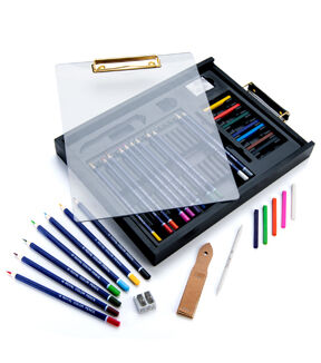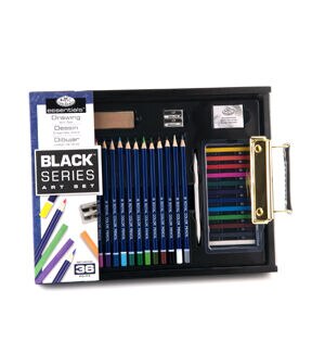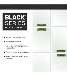 Royal & Langnickel Essentials Black Series Clear Palette Art Sets. Our Black Series Art Sets are sure to be a show stopper! Each set comes full of premium art supplies and features a clear acrylic palette or clipboard, depending upon the media type, which slides out to open the set. Any artist will love the contemporary design as well as the high quality art supplies that are packed neatly inside the multi-compartment wooden box.