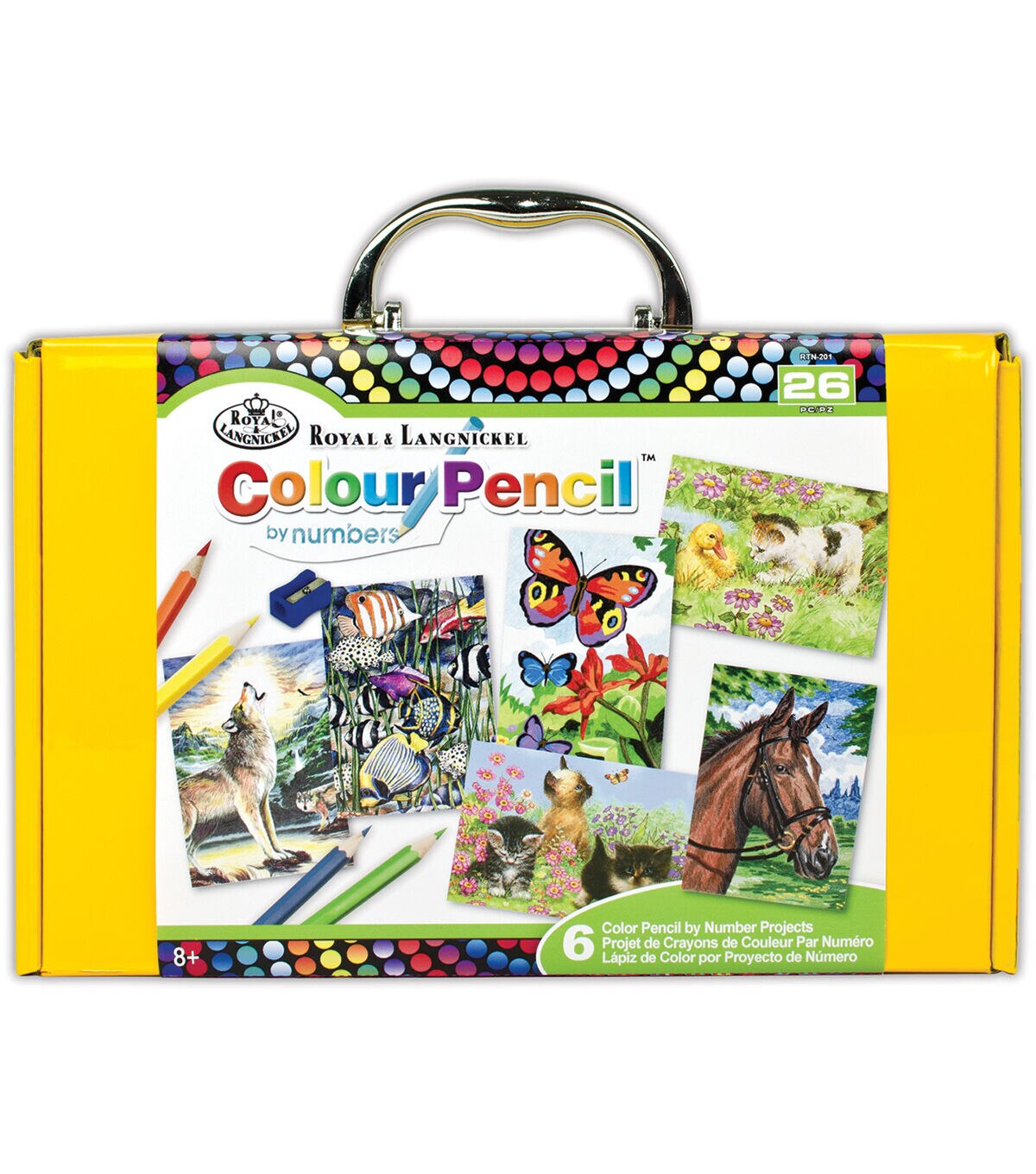 - Includes six color by number cardstock boards with a different design on each, six color by number overlays, 10 color pencils, one sharpener, one example sheet and instructions within one box with handle