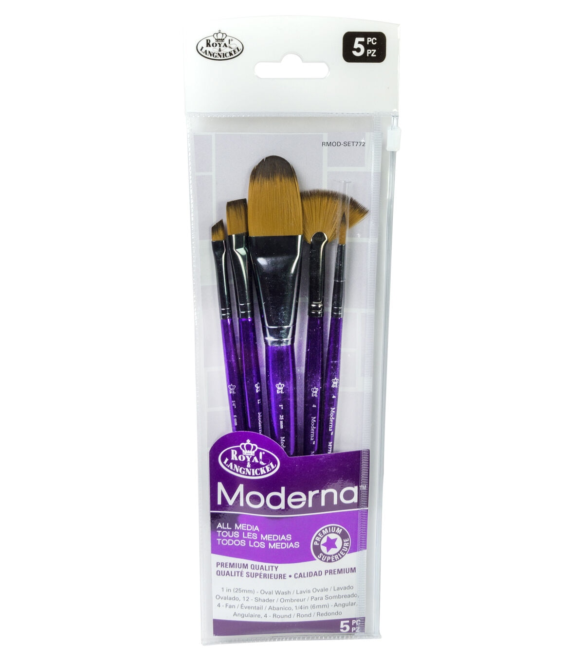 Premium All Media Brushes for the Modern Artist. Royal & Langnickel's Moderna Series 77 features an extensive line of standard length brushes designed to empower the mixed media artist. This line offers a wide selection of hair types and brush shapes that work well with all types of paint. Their premium quality, bold design and durable construction sets these brushes apart from the rest, making them the best mixed media brushes on the market today.