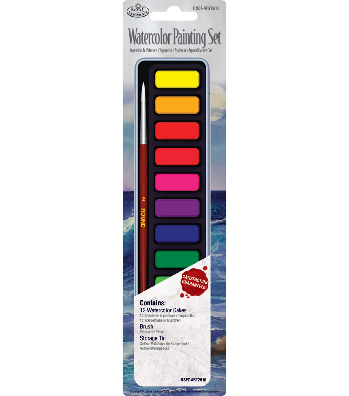 This mini tin set makes watercoloring on the go a breeze. Simply slip the set into bags, backpacks or back pockets and seize the moment when inspiration strikes. This set includes 12 vibrant watercolor cakes as well a small brush; simply moisten the cakes, wait for the water absorb and put brush to paper for vibrant results!