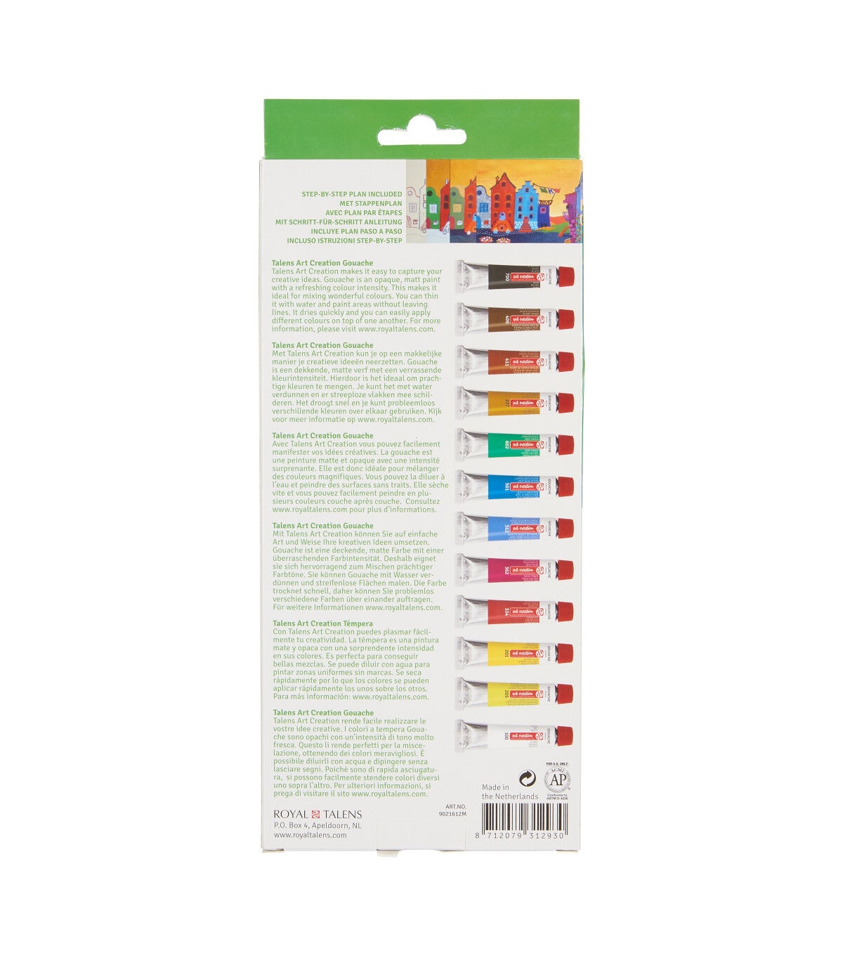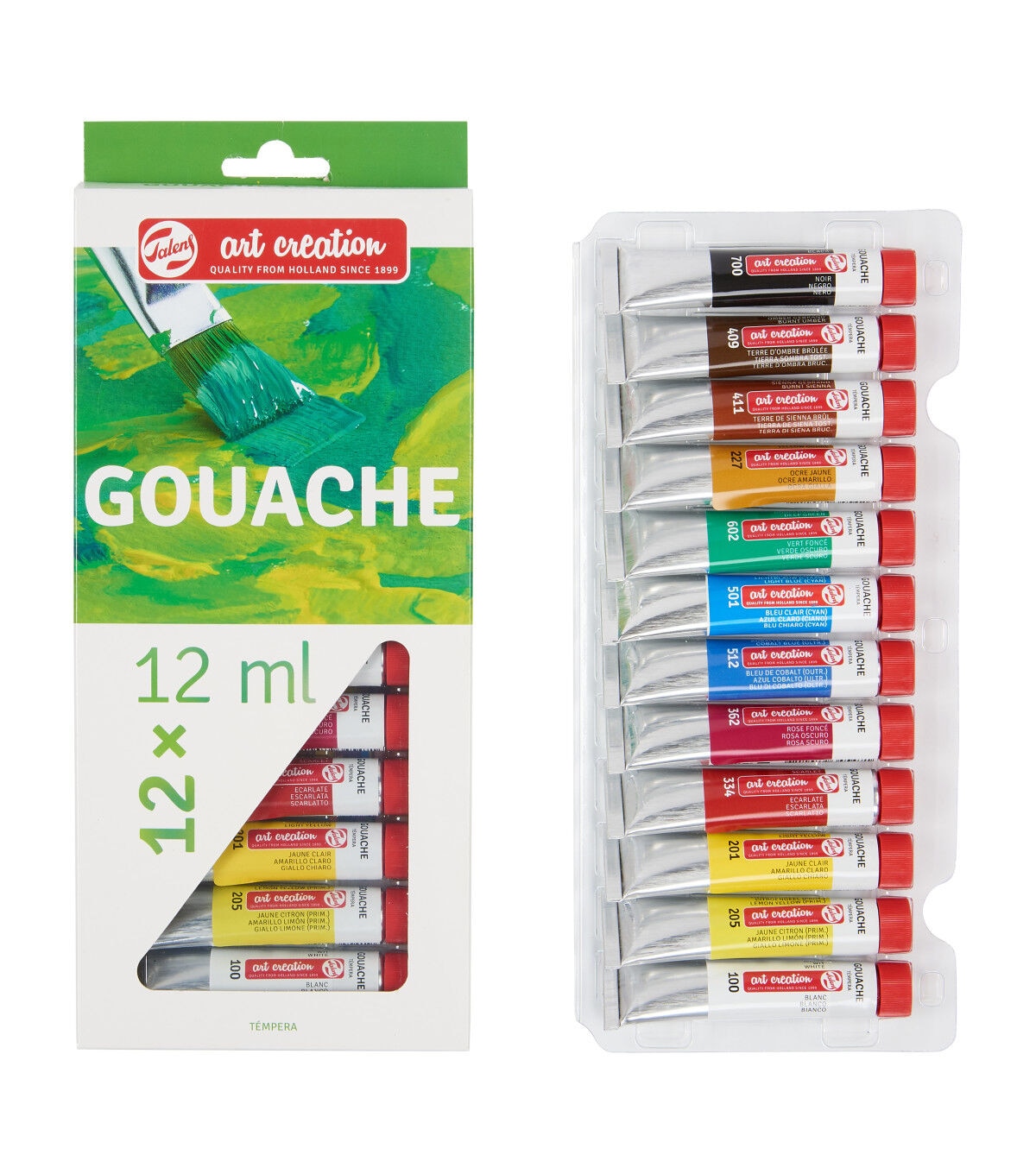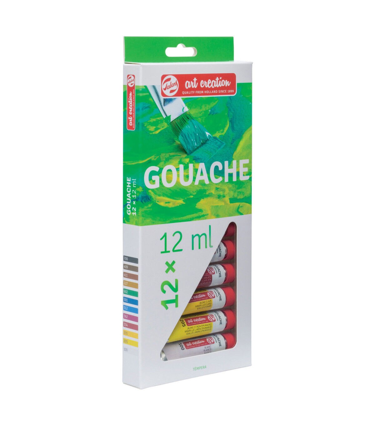 This set features opaque gouache with excellent color intensity. It can be thinned with water and dries with in several minutes. It is great for painting matt sections without leaving stripes. Various colors can quickly be painted over one another and the paint can be used on many grounds including paper, cardboard, wood and more. Great for artists, designers and illustrators and for color mixing instruction. The 12-color set includes one 12ml tube each of white, lemon yellow, light yellow, scarlet, deep rose magenta, cobalt blue ultramarine, light blue cyan, deep green, yellow ochre, burnt sienna, burnt umber and black.