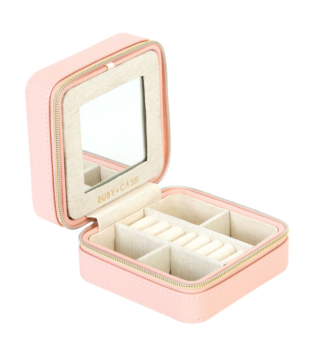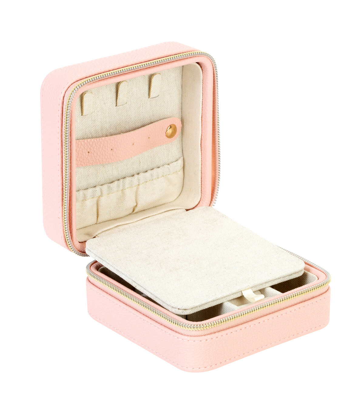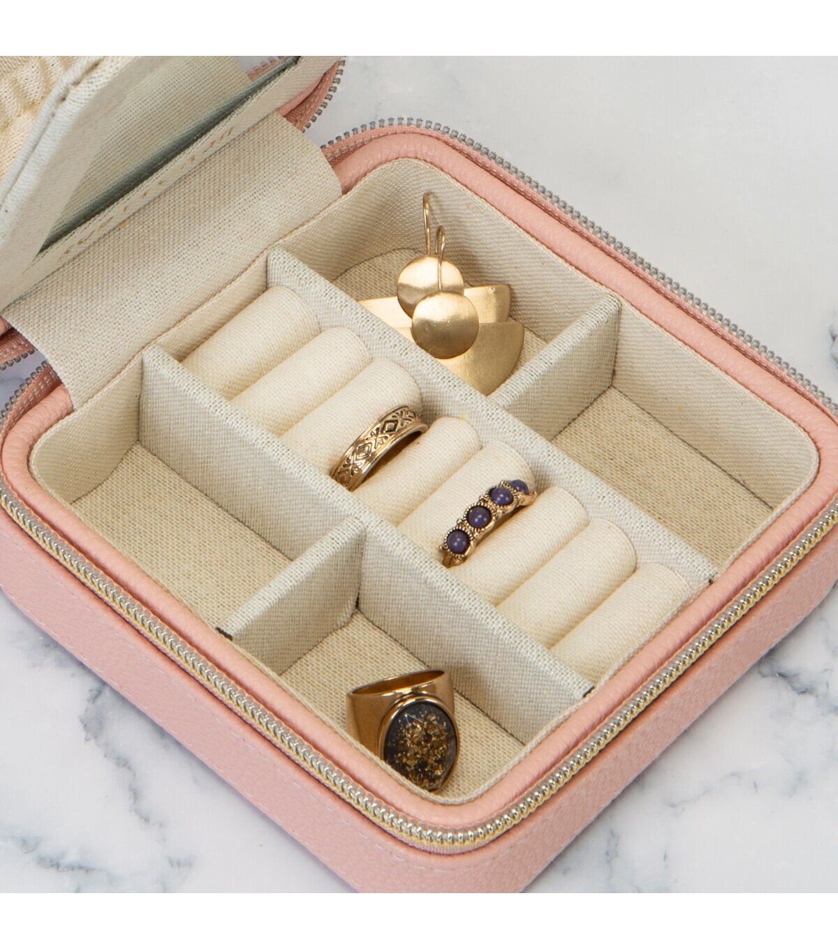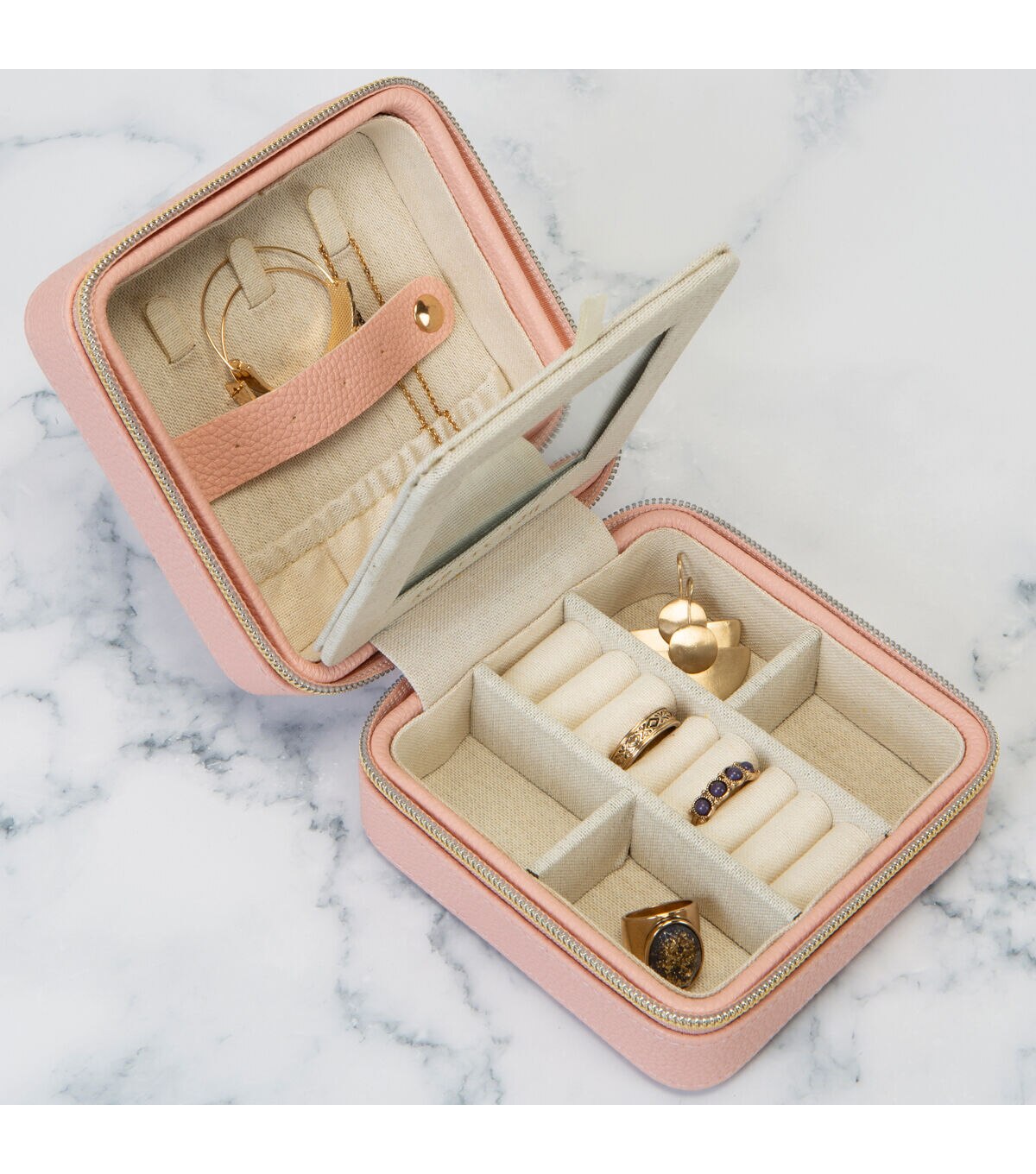 This compact case makes traveling with your favorite jewelry and accessories easy! The sleek faux leather body and gold zipper closure makes this a fashionable must have. Made up of multiple compartments for all your different jewelry pieces including an Elastic Pocket, 3 Hanging Hooks, 4 Earring Post Holes, 8 Ring Cushions, 4 Compartments. One case for all your needs keeping your jewelry untangled and neatly organized.