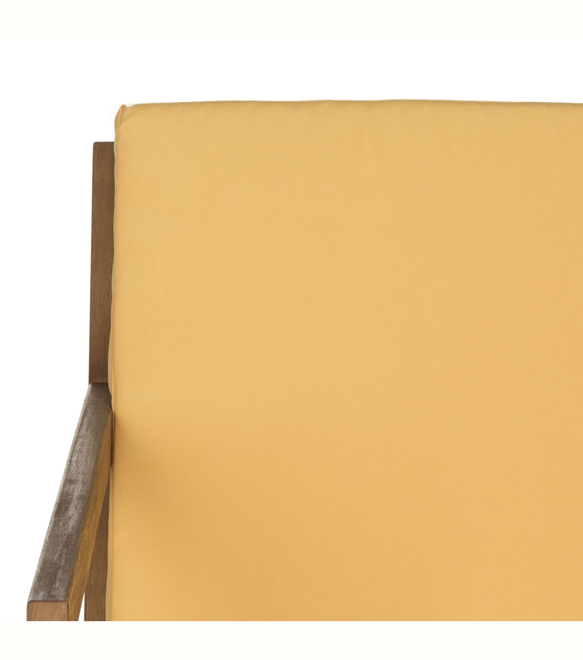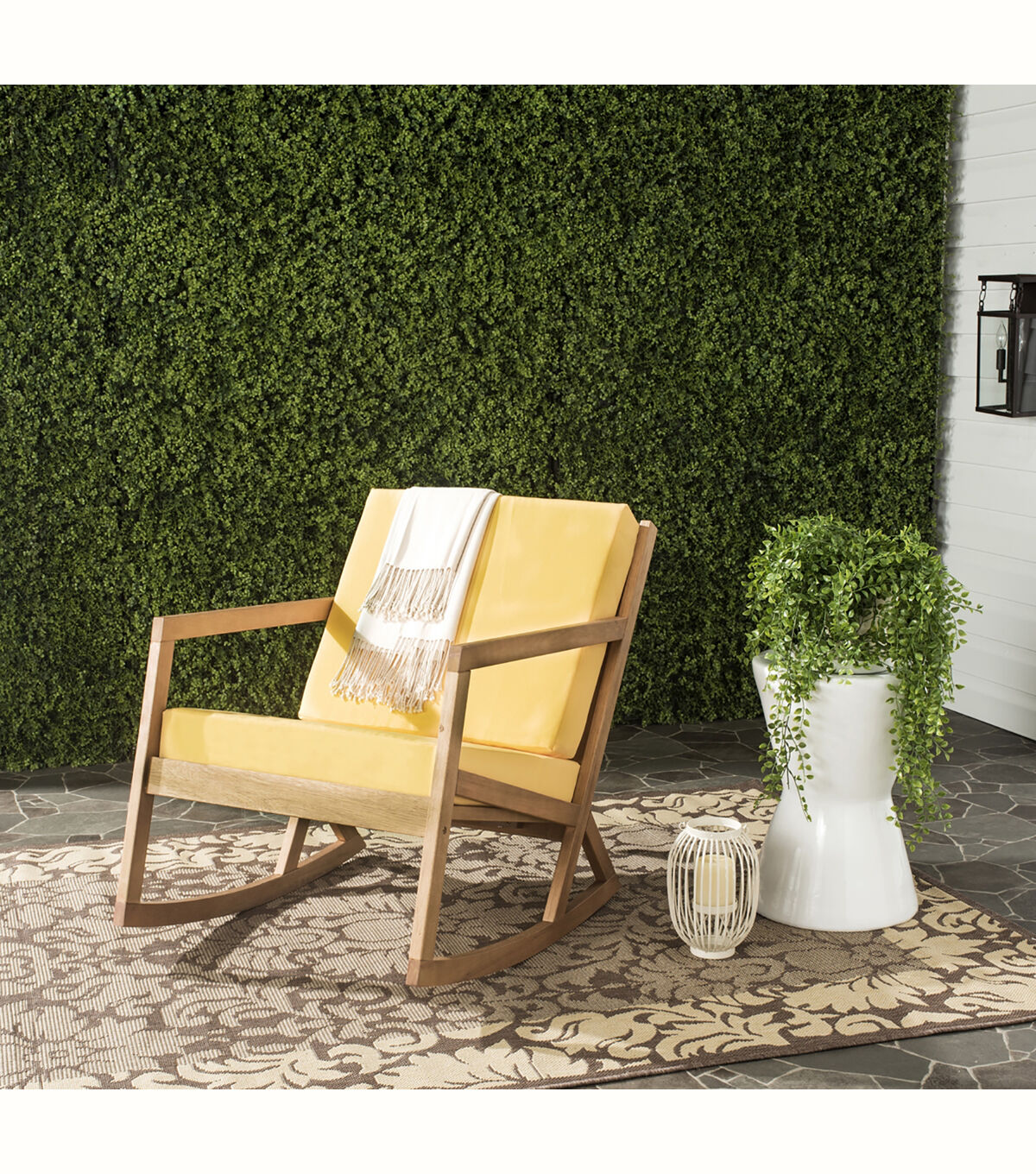 Contemporary with a nod to hand crafted Shaker individuality, this elegant outdoor rocking chair is destined to become a new American classic. Made from eco friendly Eucalyptus wood in natural finish, it comes with easy care yellow front and back cushions.
