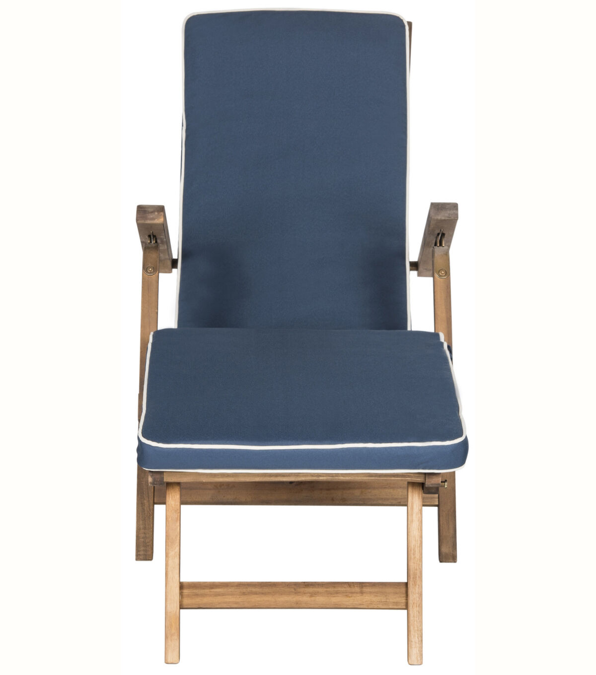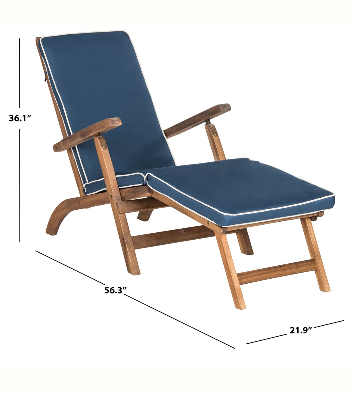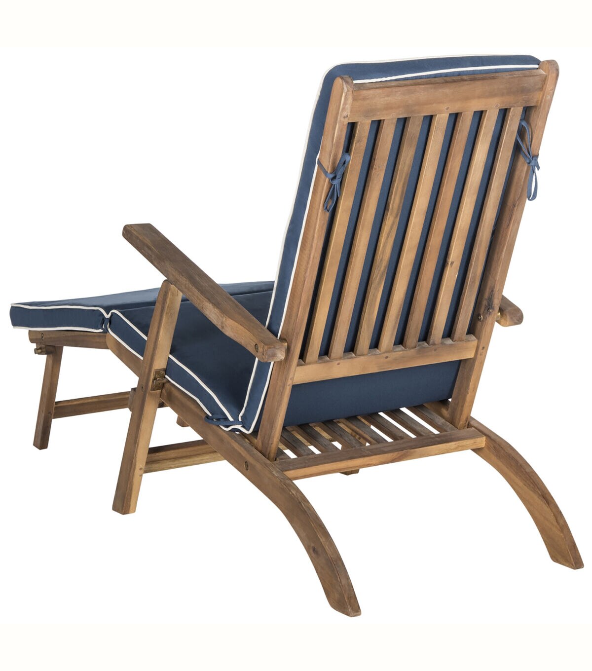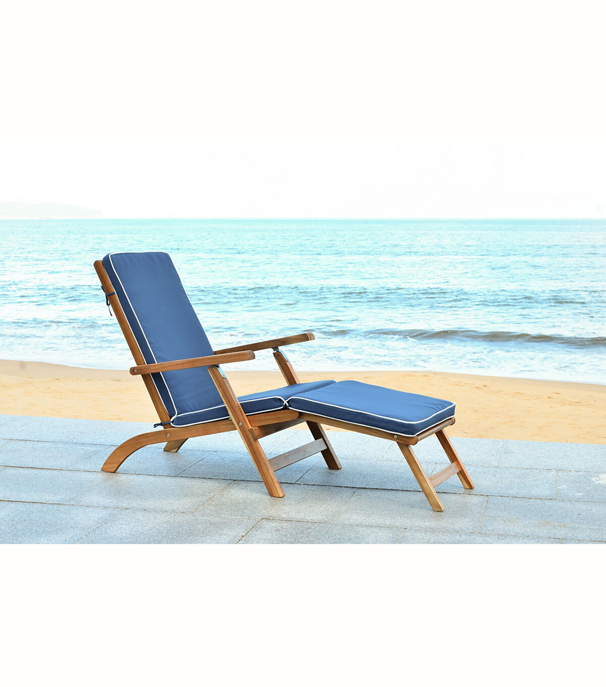 Inspired by ocean liner deck chairs, this inviting outdoor lounge exudes classic elegance. Crafted of sustainable acacia wood to withstand outdoor elements, this comfy lounge comes with an all weather cushion in navy blue with nautical white piping.