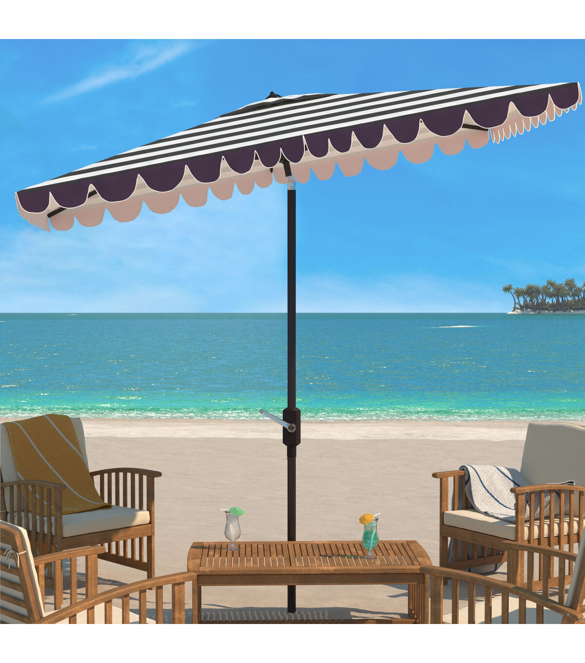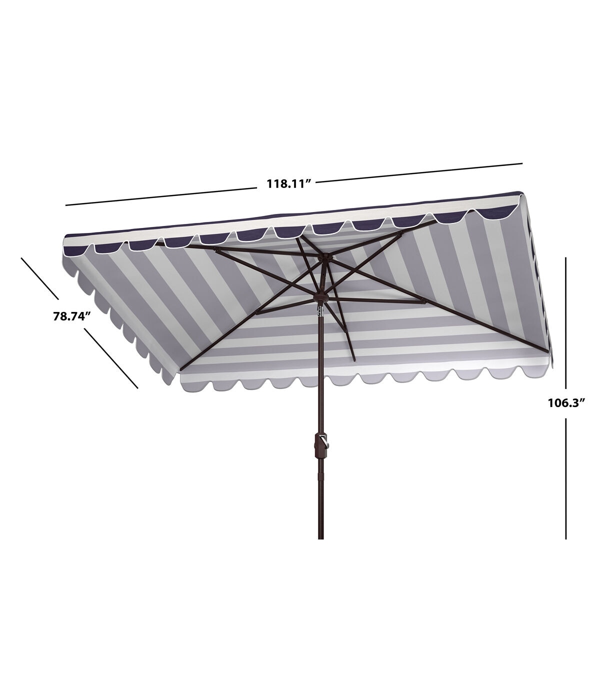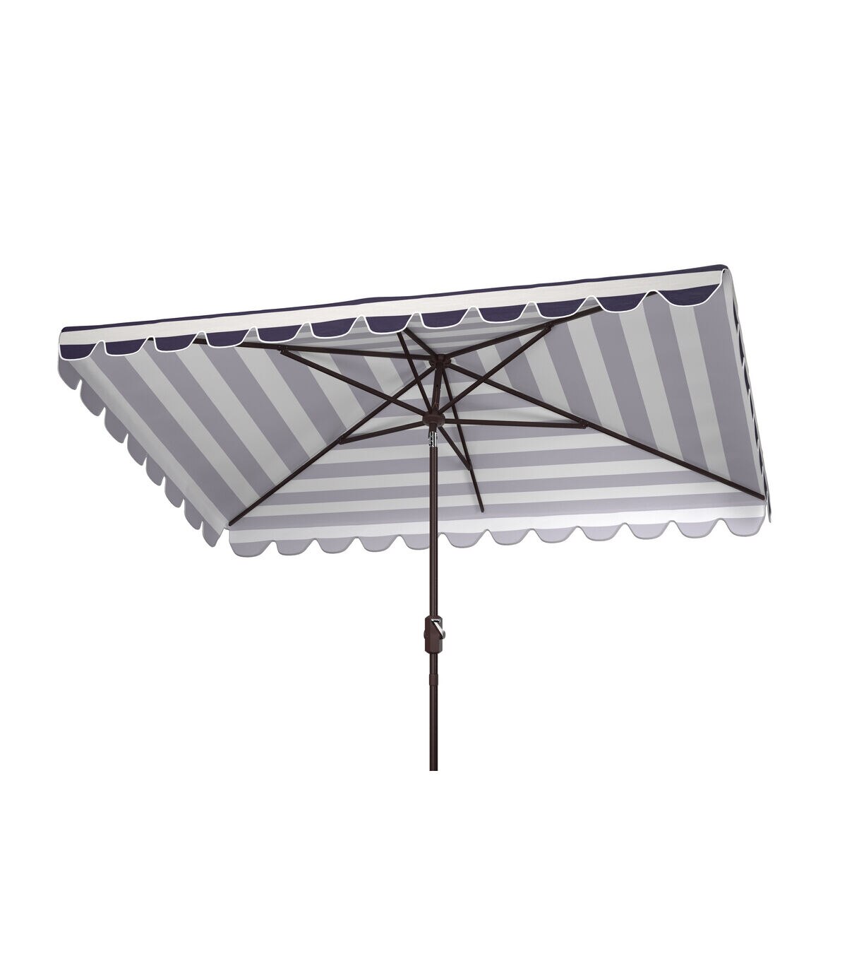 The stylish black and white stripes and scalloped detail of this chic Vienna Umbrella fashionably elevates the art of sunbathing. Vienna’s rectangular canopy protects you from harsh summer rays, and its brown aluminum post intelligently complements its neutral color palette.