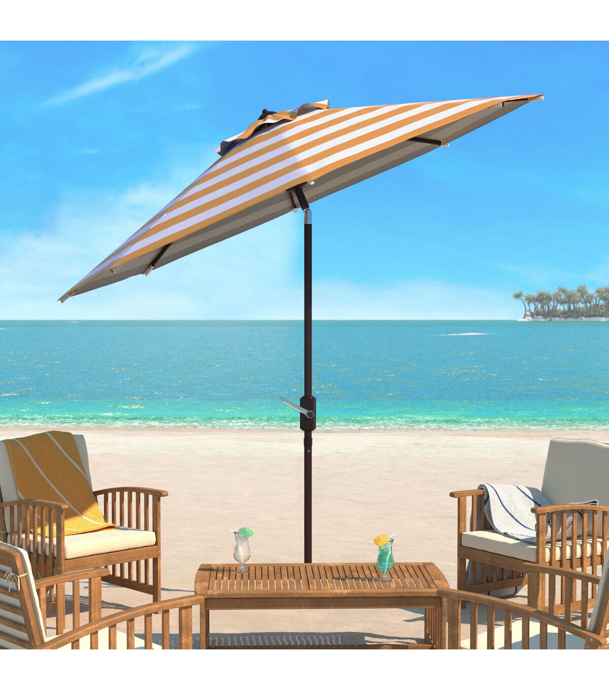 In the heart of Miami Beach sits the palatial art deco hotel whose cosmopolitan guests inspired this fashionable outdoor umbrella. Its bold yellow and white stripes bring timeless style while its clean lines make it contemporary open air couture.