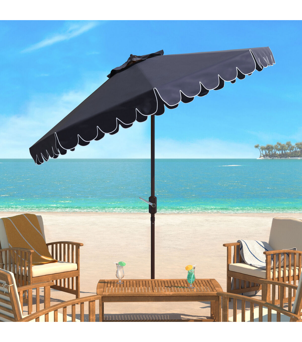The signature white and blue coloration of Santorini’s lush legendary resort inspired this nine foot crank umbrella. Its sophisticated navy hue features a single scallop white trim to create an outdoor retreat for the modern tastemaker.